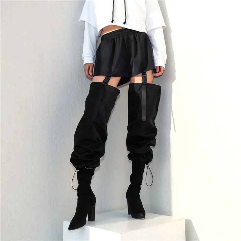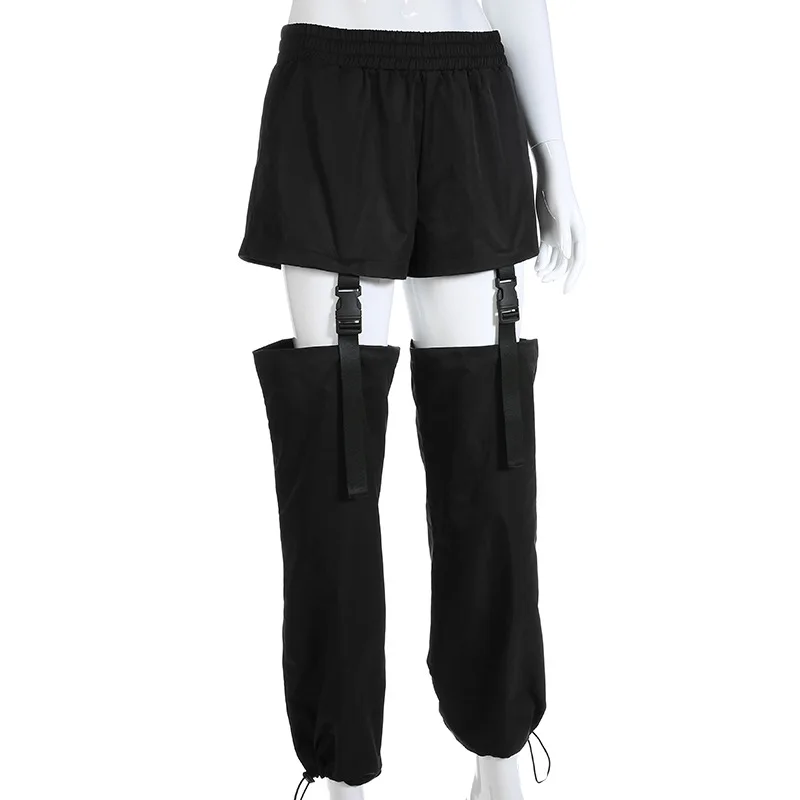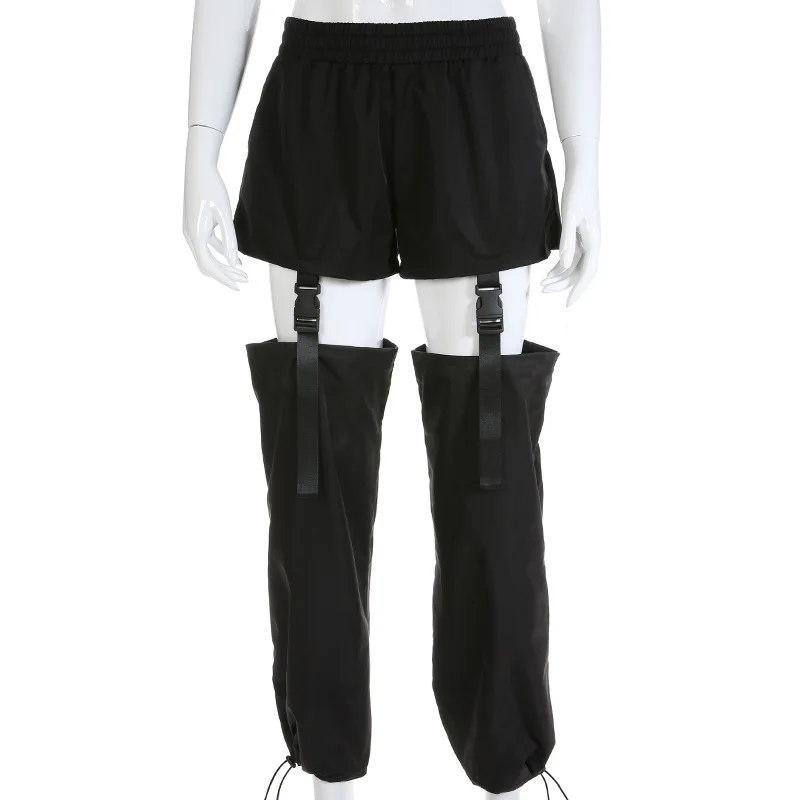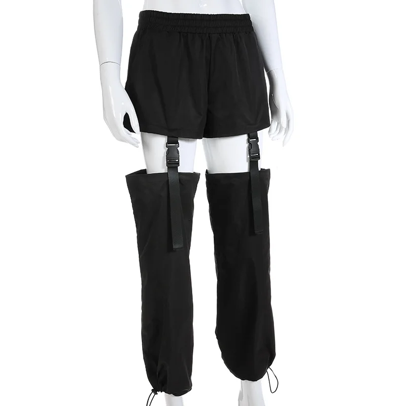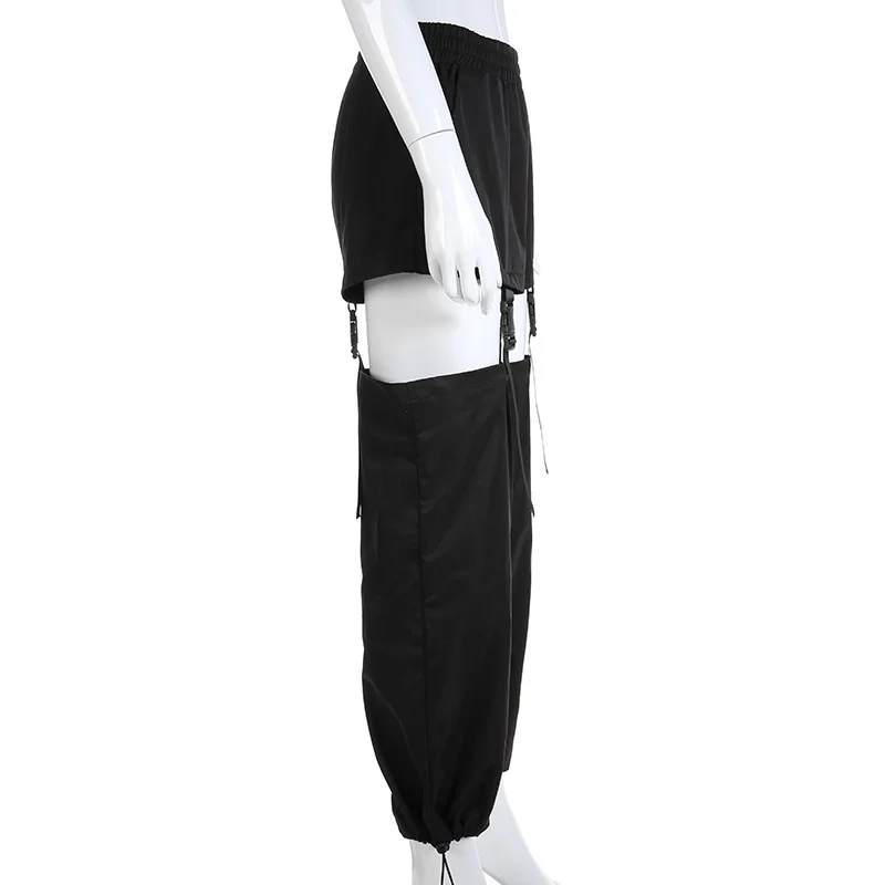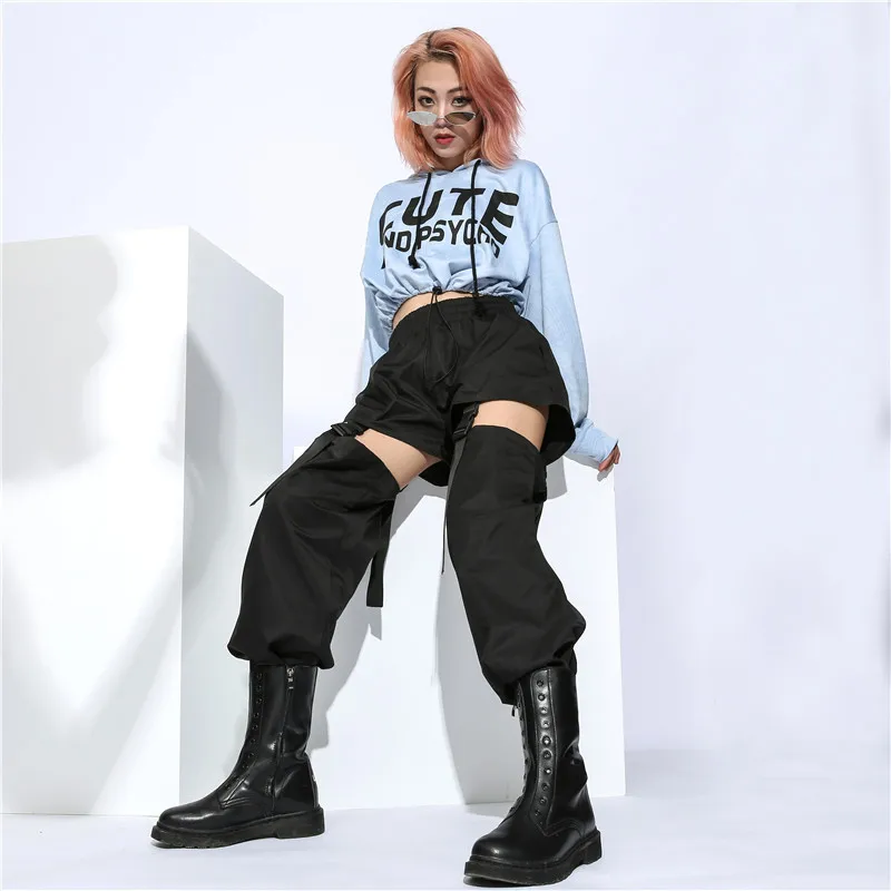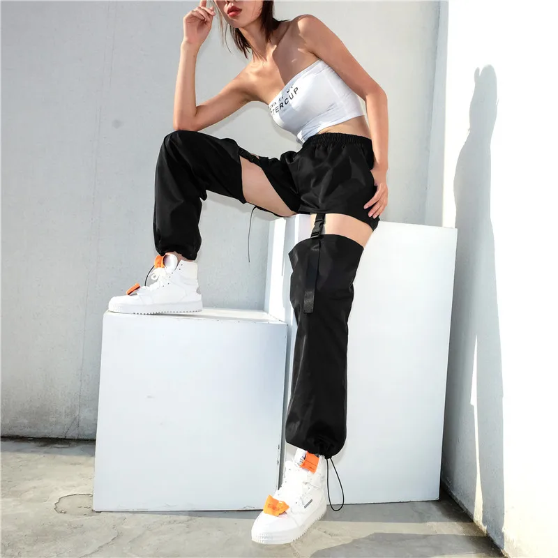Модные уличные брюки карго женские черные повседневные свободные съемные брюки с высокой талией с пластиковой пряжкой брюки в стиле хип-хоп