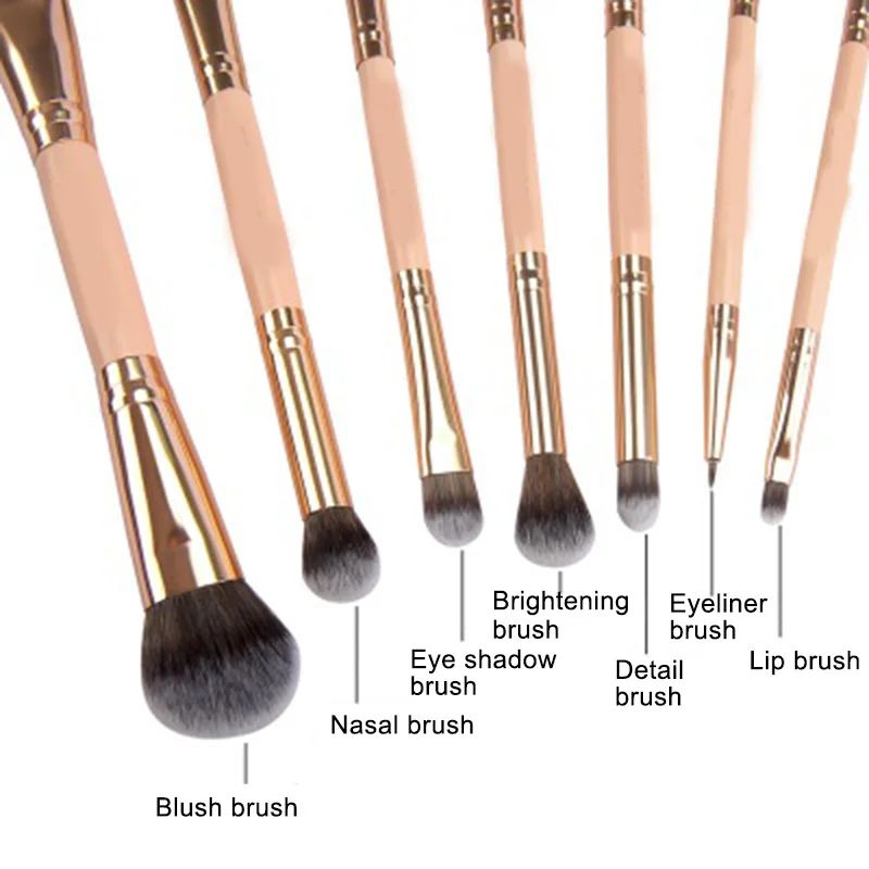 1. Содержит 7 различных кистей для макияжа, практичных для удовлетворения ваших потребностей ежедневно, подходит для румян, теней для носа, теней для век, подводки для глаз, бровей, губ, основы и т. д.