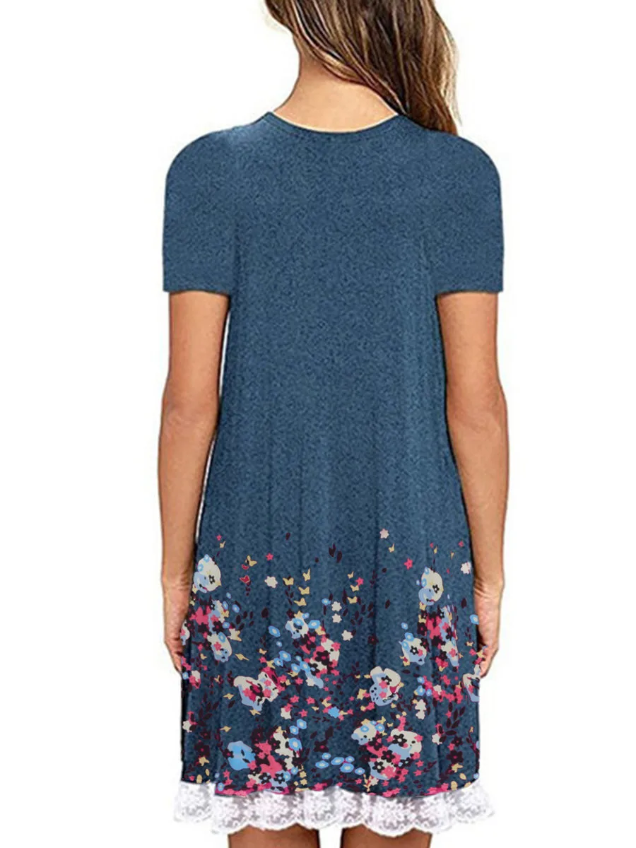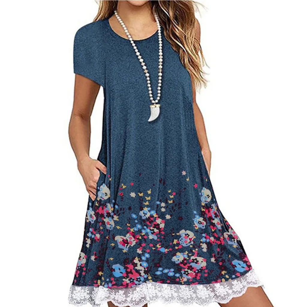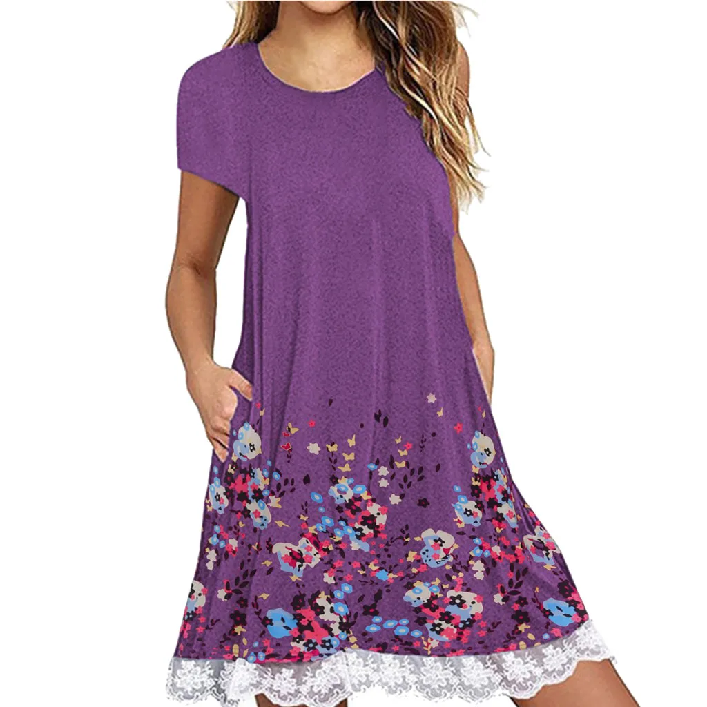 Женское платье с круглым вырезом, повседневное кружевное мини-платье с короткими рукавами и принтом, свободные вечерние платья