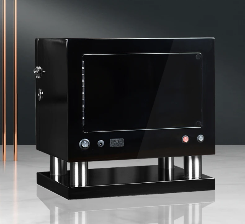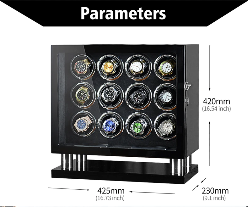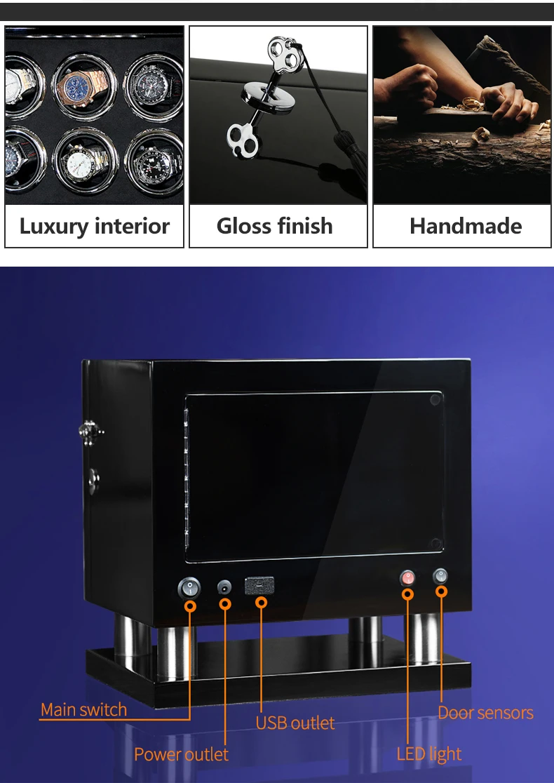 * Размер: 425*230*420 мм * Глянцевая отделка + вставка из замши/искусственной кожи * Новая управления ЖК-дисплеем * Светодиодный свет * TPD режим * 12'clock с функцией * Источник питания USB и DC * Дверные датчики (открываются для остановки, закрываются для запуска) * Подходит для различных размеров браслетов/цепей