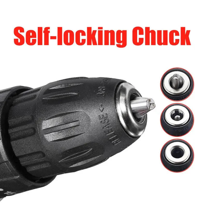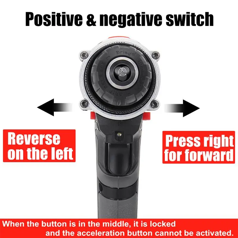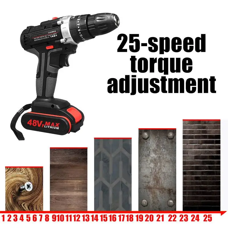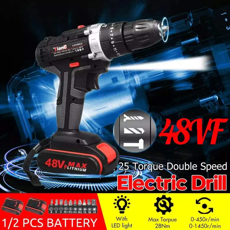 Наименование: электрическая дрельВходное напряжение: 48 ВВыходное напряжение: 21 вМаксимальный крутящий момент: 25-28 нмБез скорости нагрузки: 0-450р/мин, 0-1450р/минЗарядное устройство:Вход: 110-240 в 50-60 ГцВыход: 1.3AОсобенности-Питание от литий-ионной аккумуляторной батареи, обеспечивает более длительное время работы и большую мощность-Высокая эффективность двигателя, обеспечивает до 28N. М крутящего момента и 0-1450r/мин скорости-Сверлильный патрон для быстрой и простой замены бит-Использование вперед/обратный переключатель, 25-скорости крутящего момента-Переключатель вперед/назад может быть установлен в трех положениях:Вперед, назад и замок. Из-за блокировочного механизма, передний/обратный переключатель может быть отрегулирован только при отсутствии нажатия на триггер. Перед использованием переключателя вперед/назад двигатель всегда должен полностью останавливаться.-Светодиодный Светильник обеспечивает освещение в темных пространствах при работе-Эргономичная ручка обеспечивает идеальный баланс и контроль инструмента-3 s настройки: ударное сверление, плоское сверление и поворотные винтыПредупреждениеЧтобы уменьшить риск травм, надевайте защитные очки или очки с боковыми щитами.Посылка включает:1 электрическая дрель1 х адаптер питания1/2 x батарея (опционально)1 Набор буровых головок