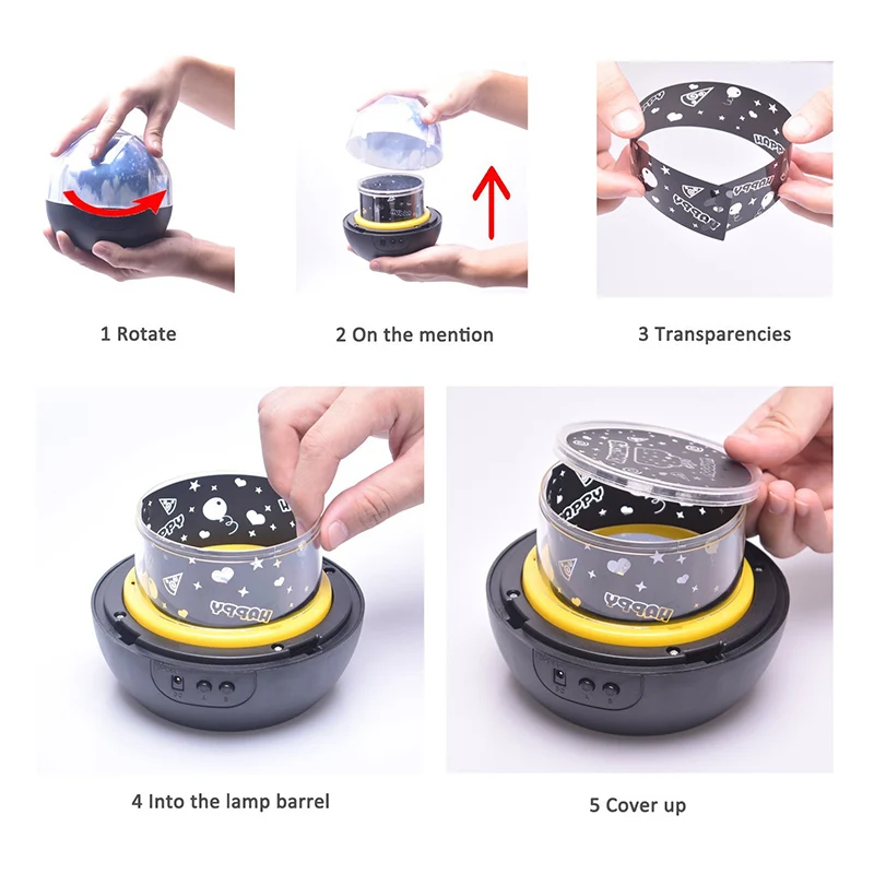 Features: 1.Multifunctional-- Can be used as a Projector Lamp when Put Off the Protect Shade, Also can be used as a Night Light when Put On the Protect Shade. 2.Five Sets Of Film-- With Magical universe, Merry Christmas,Starry star,Blue Ocean,Happy Birthday.Thus beautiful light will be projected to ceiling or wall, Press Button B for 2 Seconds then the light will rotate. 3.Six Lighting Effects - White, Blue, Yellow, Sequential, Combination, Slow fade.Explore the mysteries of the universe. 4.Convenient -- Two Power Supply: 3 x AA Batteries or USB Charger. 5.Ideal for decorating wedding, birthday, parties. Great for romantic night lamp and decoration light use. Specifications: 1.Lampshade: Universe Planet Moon Star Lamp 2.Film Pattern: 1 x Universe, 1 x Stars, 1 x Ocean, 1 x Birthday, 1 x Moon 3.Material: ABS+PC. 4.Product Size: 5.1 x 4.7 inches 5.Voltage: 12V 6.Dimming: 3 Step Dimmable 7.Power Supply: USB Charger/3 x AA Battery (Can Not Use In The Sametime). 8.Function: Night Light And Projector Can Be Changed Easily Package: 1 x Star Moon Universe Projector Lamp(Battery Not Included) 1 x USB Cable 5 x Film Pattern (1xUniverse 1xStar 1xOcean 1xBirthday 1xMoon) 1 x English User Manual 1 x Gift Box