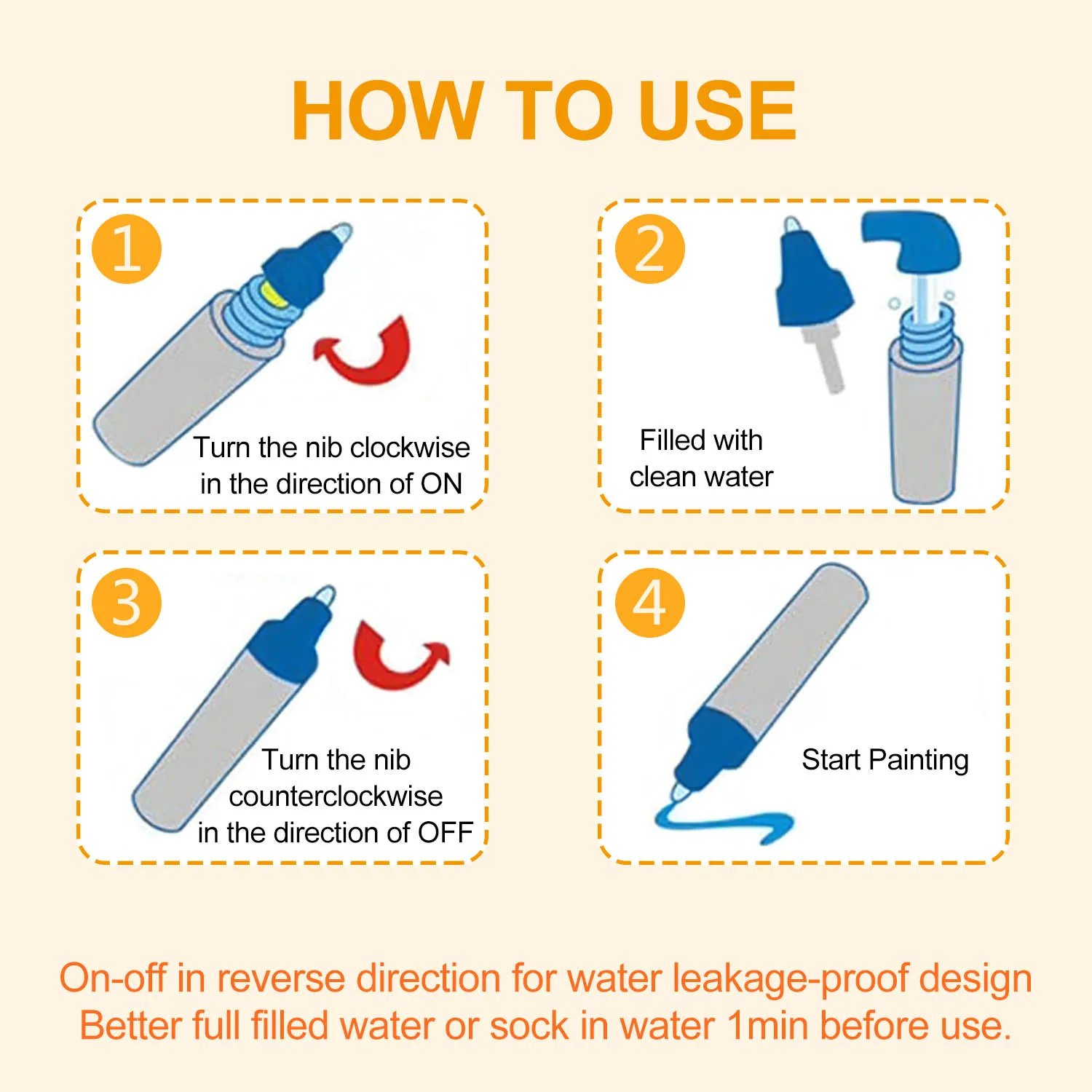 Просто нужно заполнить ручку водой, затем начать окраску, и она исчезнет около 15 минут, поэтому дети могут повторно рисовать на этом полотне краски.