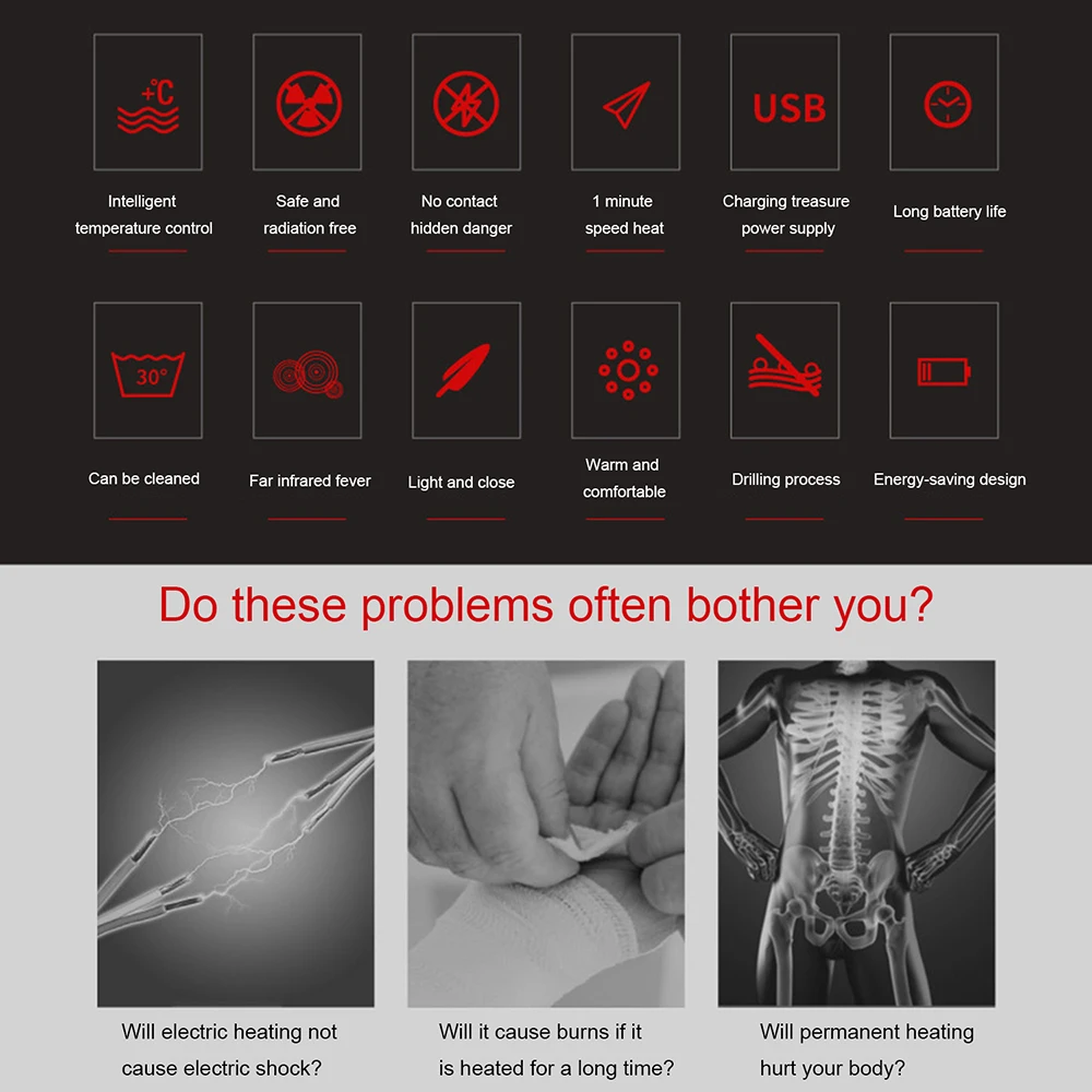 Гуманная нагревательная часть предназначена для обогрева и может быстро нагреваться даже в экстремально холодную погоду. Идеально подходит для всех видов активного отдыха, таких как подметание снега, катание на лыжах, Кемпинг, Пешие прогулки. Он также очень подходит для людей, которые всегда ощущают боль в костях в холодные или дождливые дни.