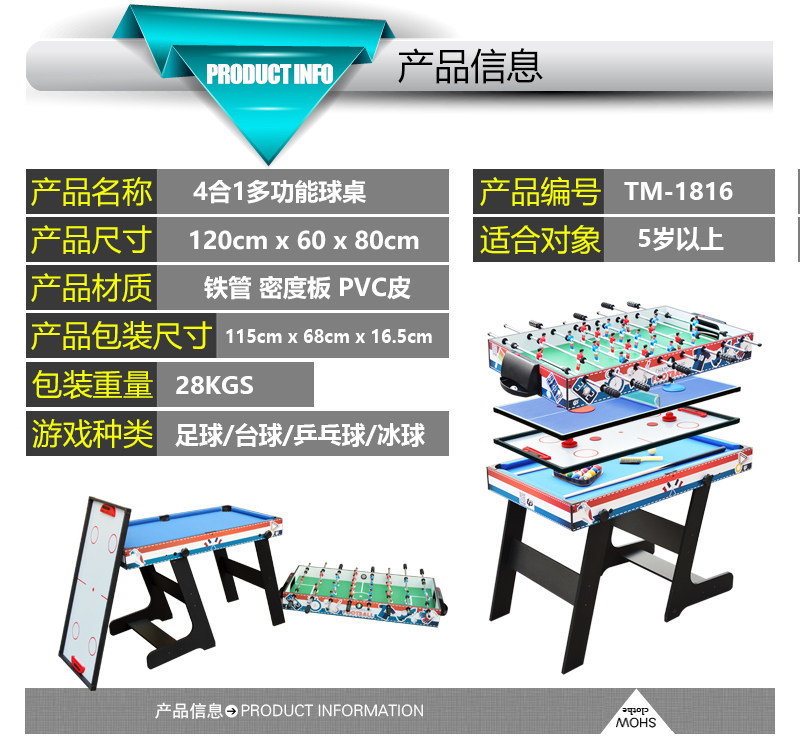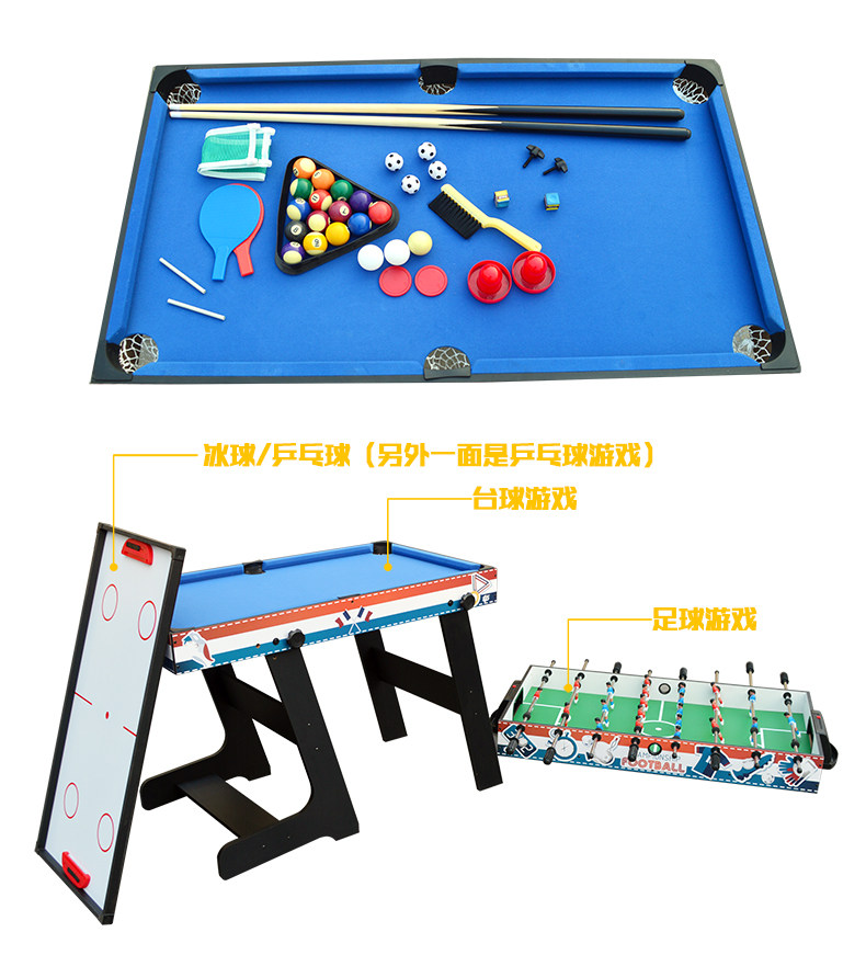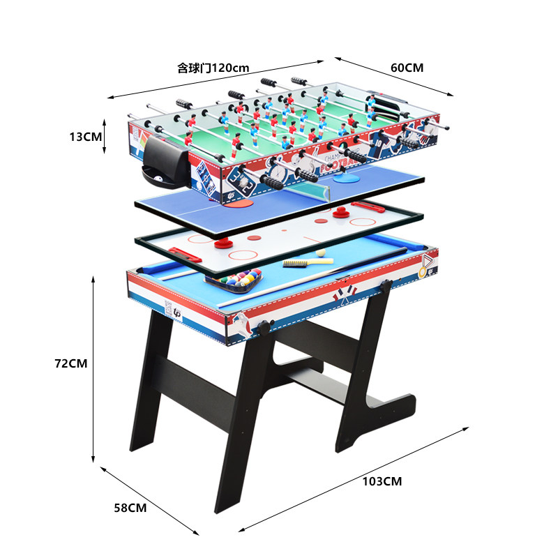 Модель: TM-1816 Наименование товара: многофункциональный сборный бренд американского футбольного мяча/бильярда/хоккея/настольного тенниса (4 вида funcion) Функция: Отдых и развлечения/взаимодействие родителей и детей/Семейная Игра patry PK racing Особенности: ковка способность мышления/тест скорости реакции и со степенью мозга Применимые люди: дети и взрослые Применимые случаи: домашние вечерние/Бар Отель командная игра/Офис Отдых игра Вес: около 30 кг Цвет: как детали Материал: Высококачественная Экологически чистая плита высокой плотности/ABS/труба из нержавеющей стали Размер: стандартный размер около 120*60*80 см