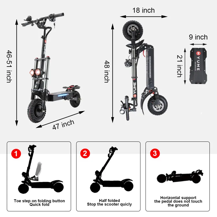 YUME Y10 мощный 10 "двойной двигатель 2400 Вт внедорожные шины до 40 миль и 40 миль/ч складной электрический скутер для взрослых Основные характеристики: ★[Мощный двигатель и скорость]: Мощный 2400 Вт высокоскоростной бесщеточный двойной двигатель постоянного тока, достигает скорости 40 миль/ч ★[Большой диапазон]:52V23.4AH литиевая батарея и самый длинный диапазон 40 миль. ★[Двойное Демпфирование] Специальная двойная пружинная Передняя и задняя амортизирующая структура. Более удобная и безопасная ★[Внедорожные шины] 10 дюймовые большие колеса внедорожные шины, адаптируются ко всем видам тротуара. Отличная амортизация и противоскользящие ботфорты ★[Складная конструкция] Быстрый складной механизм позволяет сложить и развернуть его за считанные секунды, что позволяет легко положить его в багажник автомобиля, подходит для путешествий дома.