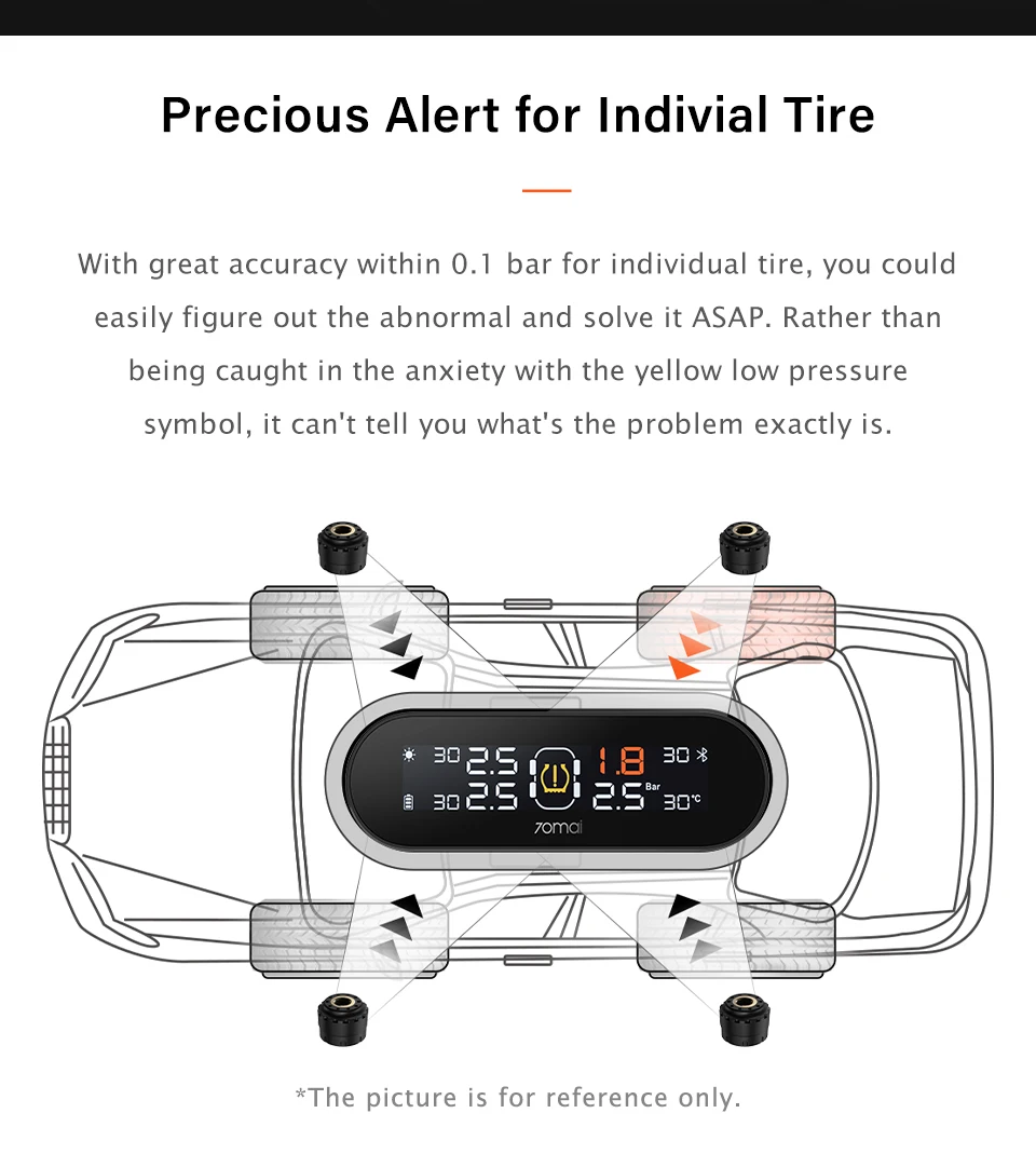 1. Что такое TPMS? Система контроля давления в шинах (TMPS)-это электронная система в вашем автомобиле, которая отслеживает давление воздуха в шинах и оповещает вас о том, когда он опускается на опасный низкий уровень. 2. Какое приложение для TPMS? Это английское приложение "70mai". Вы можете найти 70mai на вашем мобильном app store непосредственно, есть английская версия 70mai app для android и iOS системы. 3. Как долго длится батарея датчика? Могу ли я самостоятельно заменить аккумулятор? Рассчитанный в соответствии с ежедневным временем вождения в 2 часа, аккумулятор имеет срок службы 10 лет. Когда встроенный датчик не работает, аккумулятор не может быть заменен автономно. Рекомендуется заменить датчик напрямую. 4. Подходит ли он для всех моделей? Работает для большинства моделей автомобилей 5. Можно ли регулировать эти датчики? Датчик может быть удален и заново. Вы можете отрегулировать их, если вам нужно. 6. Как его установить? Следуйте инструкциям в руководстве по эксплуатации, чтобы установить его. И вы также можете нажать ссылку для справки //help.70mai.asia/465.html 7. 70mai TPMS английская версия? Посылка и товары-это только китайские слова. Вы можете использовать английское приложение "70mai" для управления TPMS. Будет английская версия на вашем мобильном телефоне приложения 70mai. 8. Работает ли Солнечная зарядка в пасмурный день? Да. Как правило, полная Солнечная зарядка может работать в течение 3 дней и может работать в пасмурные и туманные дни.