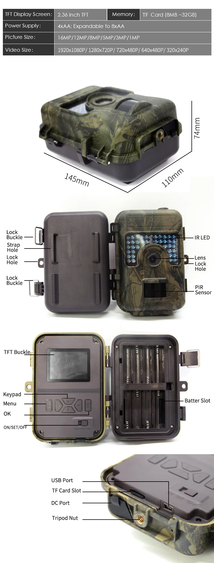 Спецификация продукта: ● Тип батареи: 4 × AA (расширяемый до 8 × aa) ●Режим ожиданияВремя: 3-6 месяцев ● Внешняя память: TF карта до 32 Гб ● Поддержка Languag: Английский, китайский, французский, норвежский, немецкий, испанский, португальский, японский, русский, финский, итальянский, чешский, румынский, шведский, корейский ● Рабочая температура:-20 ℃ ~ + 70 ℃ ● Водонепроницаемость: IP66