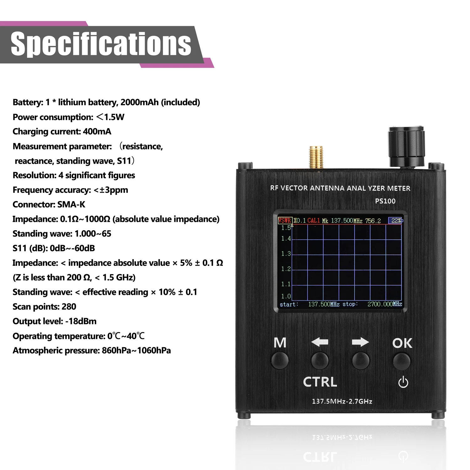 Направленность по уровню поверхности: < 35dB (140 МГц ~ 2 ГГц после калибровки), < 30dB (2 ГГц ~ 2,7 ГГц)