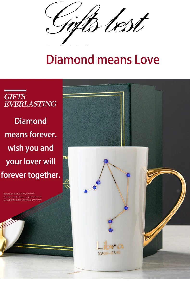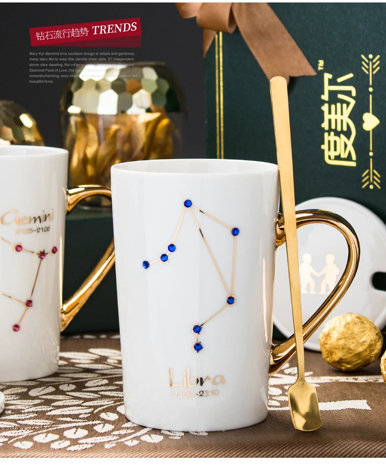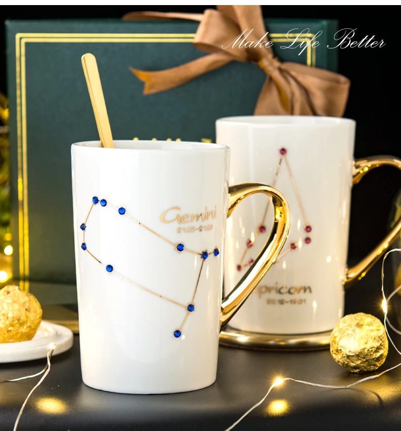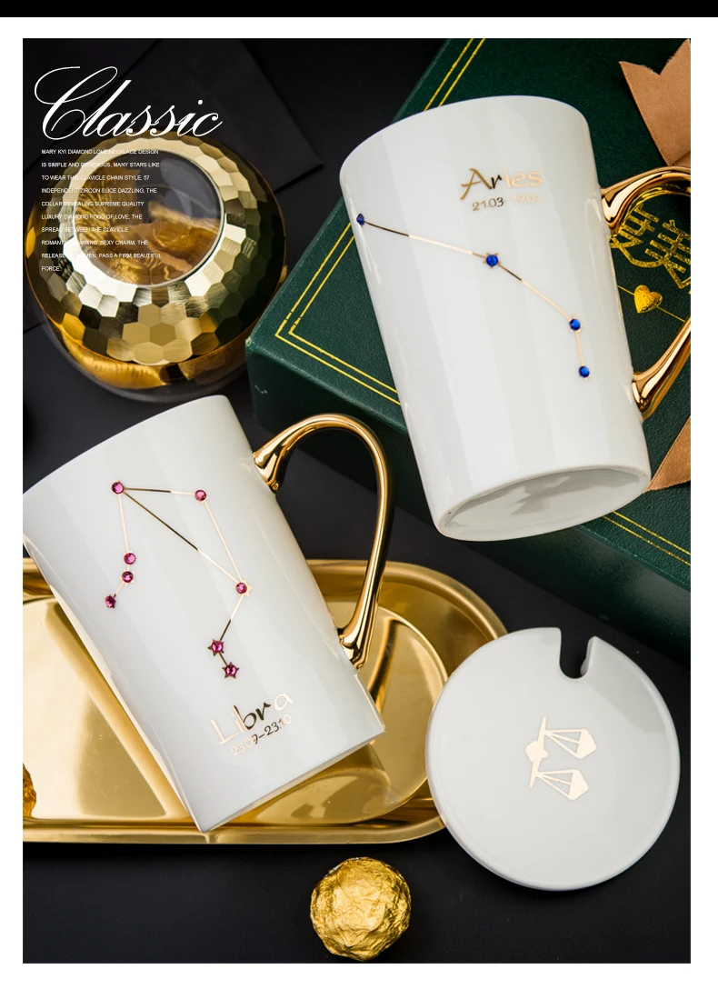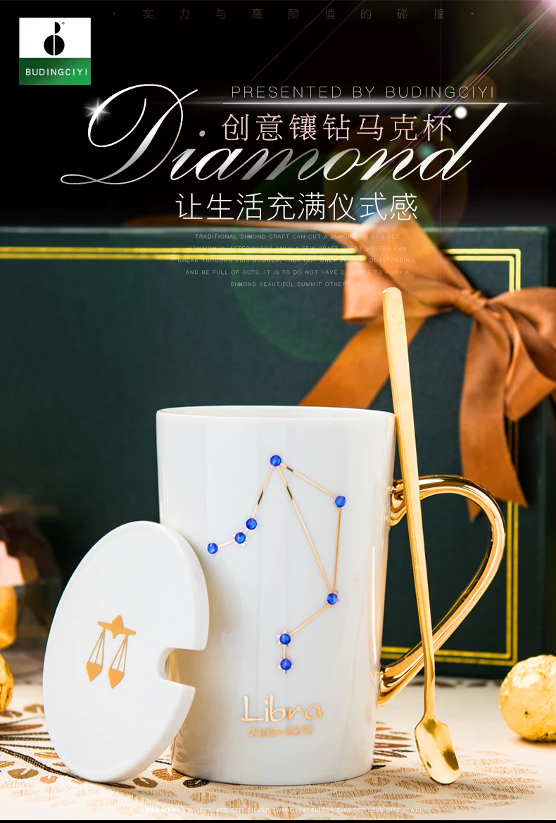 12 унций креативная фиолетовая и синяя Алмазная керамическая кофейная кружка фарфоровая чайная чашка с золотой росписью в подарок с крышкой и ложкой