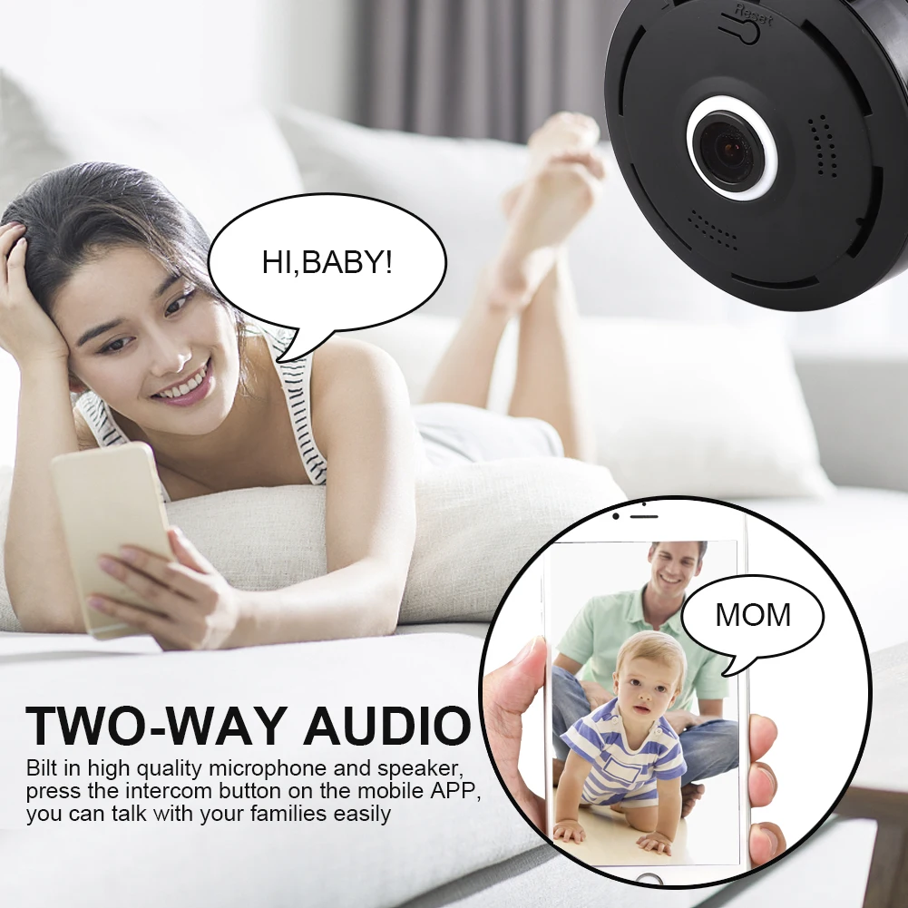 Эта ip-камера Wi-Fi в основном предназначена для личного наблюдения, чипсет и датчик специально оптимизированы для использования на мобильный телефон. Он может использоваться во многих случаях, детский монитор, уход за пожилыми людьми, управление небольшим магазином и наблюдение за помещением. Система камеры проста и практична. Просто нужно настроить камеру, затем вы можете использовать свой телефон для удаленного просмотра в любом месте, для мониторинга в офисе, в другом городе или в других странах. Если вы ищете ip-камеру Wi-Fi для легкого удаленного просмотра, это самый подходящий продукт до сих пор. Панорамный вид на 360 градусов, смотрите всю картину дома, не поворачивая камеру, монитор без мертвого угла.
