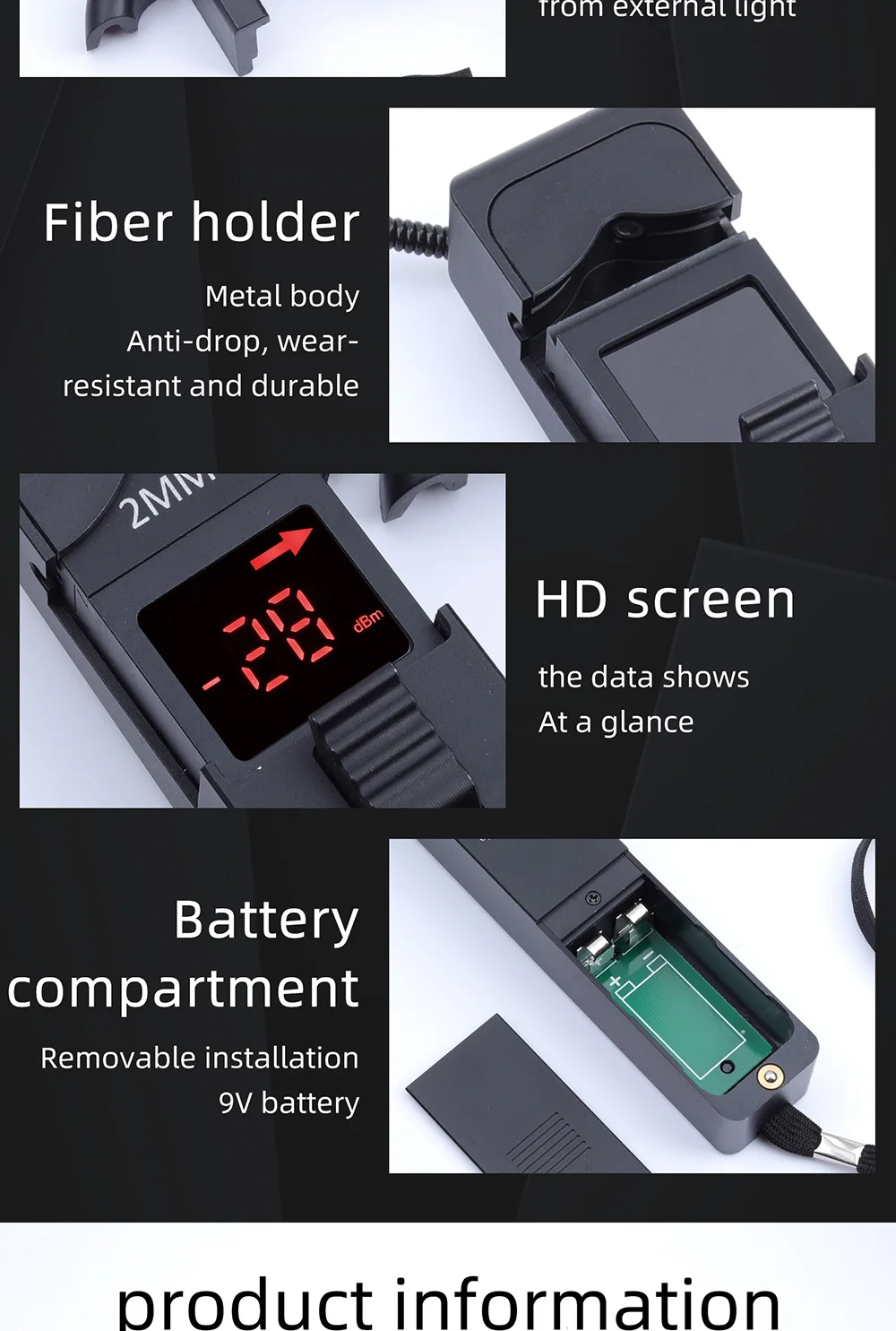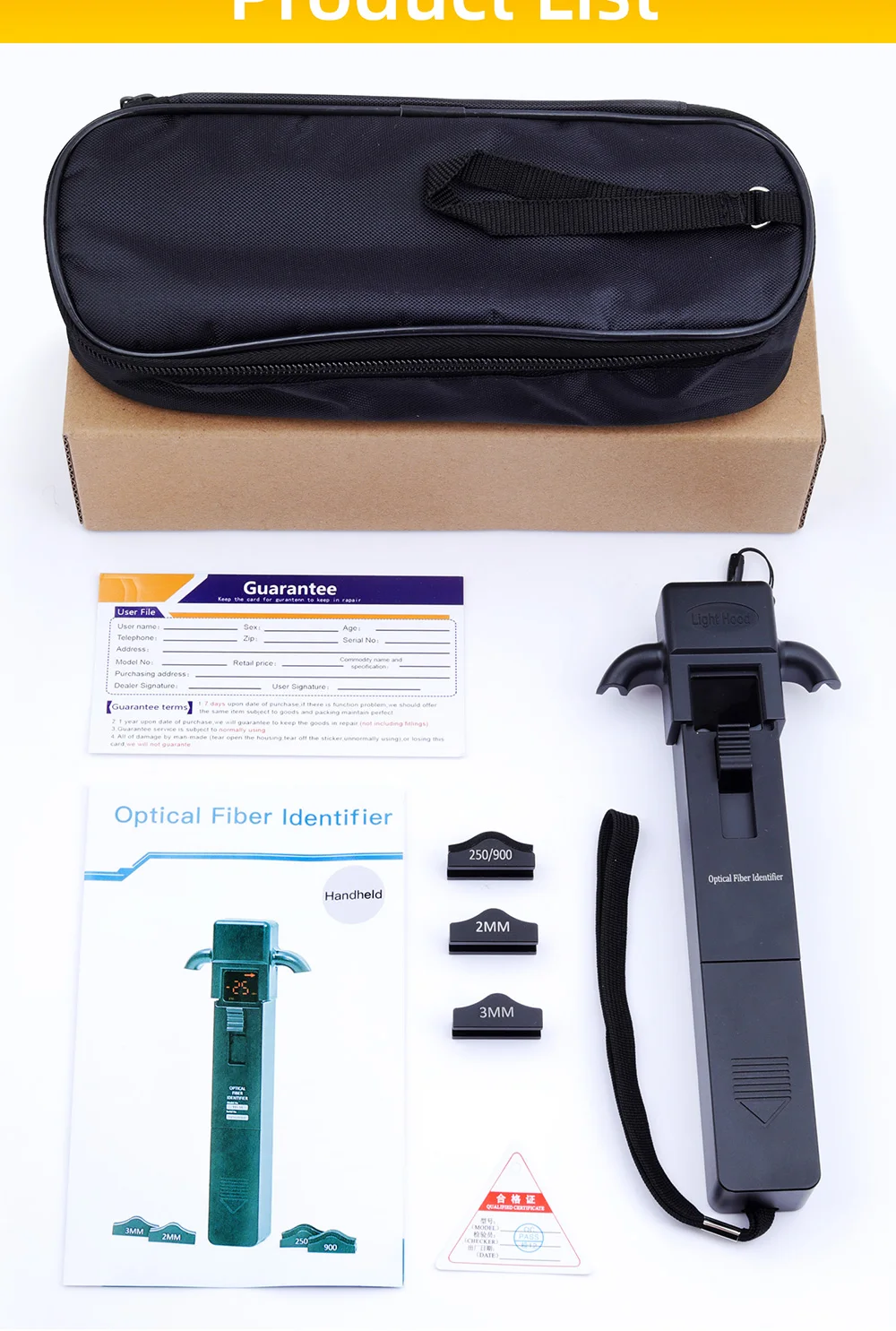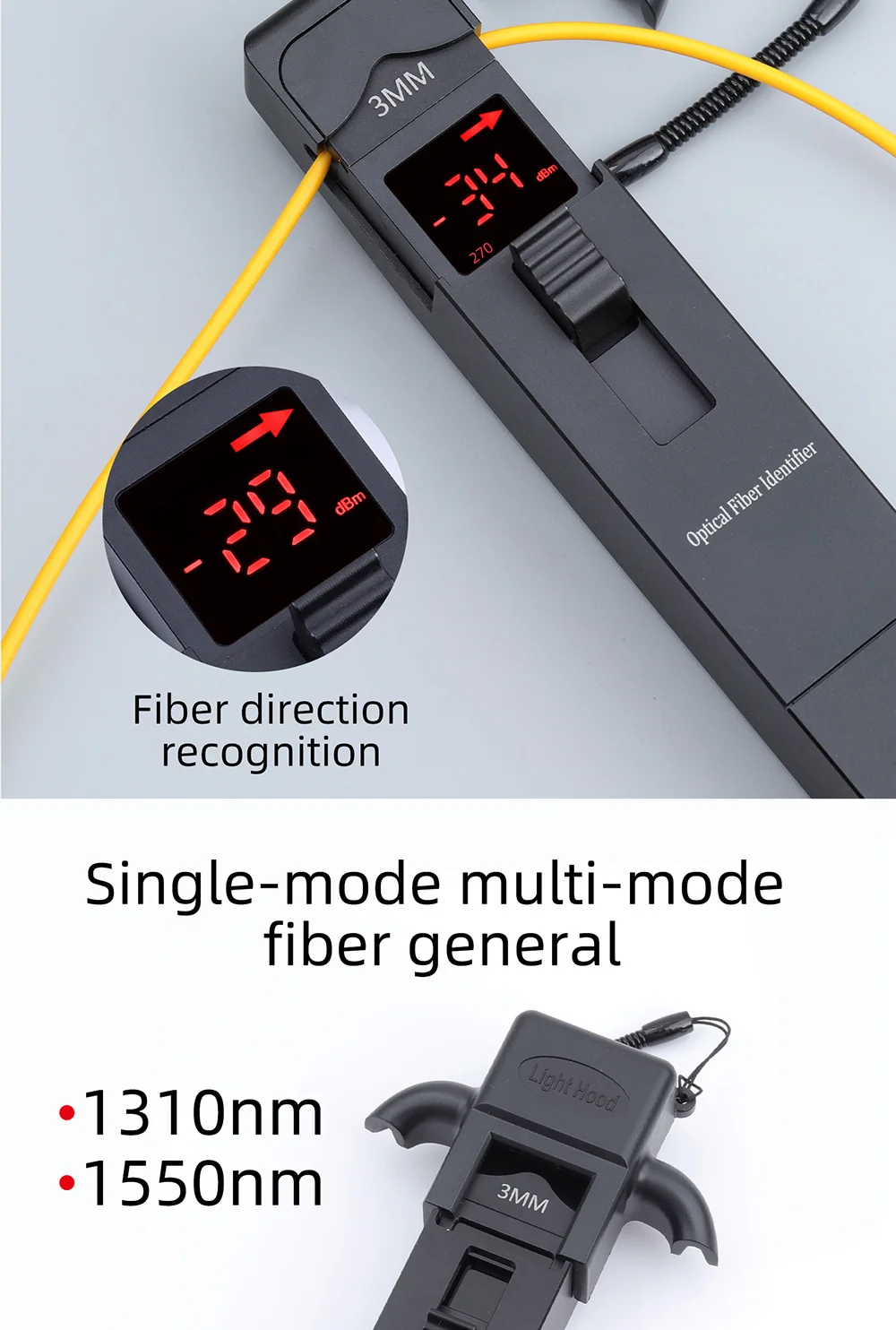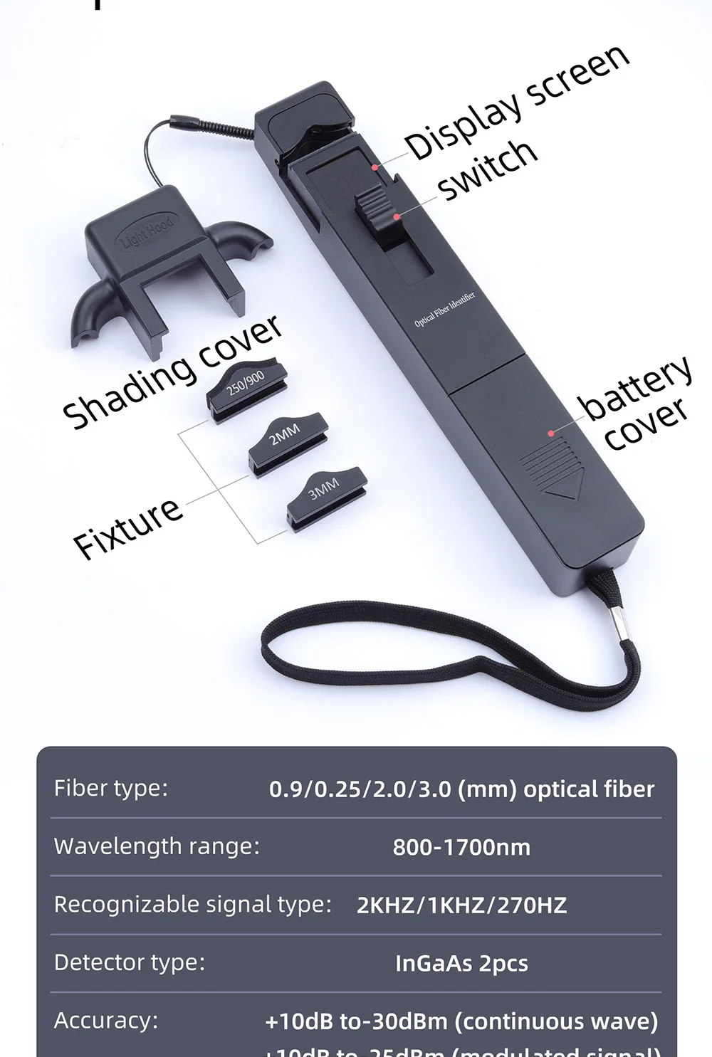 Features:1. Digital display of relative optical power in the fiber2. Portable style, can distinguish the direction and frequency of light without interrupting the fiber3. Adopt "one-touch" operation mode to make operation simple and convenient4. Provide corresponding adapter head for bare fiber and multiple pigtails5. Can identify 3 commonly used signal frequencies, namely 2KHz, 1KHz, 270HzWavelength recognition range