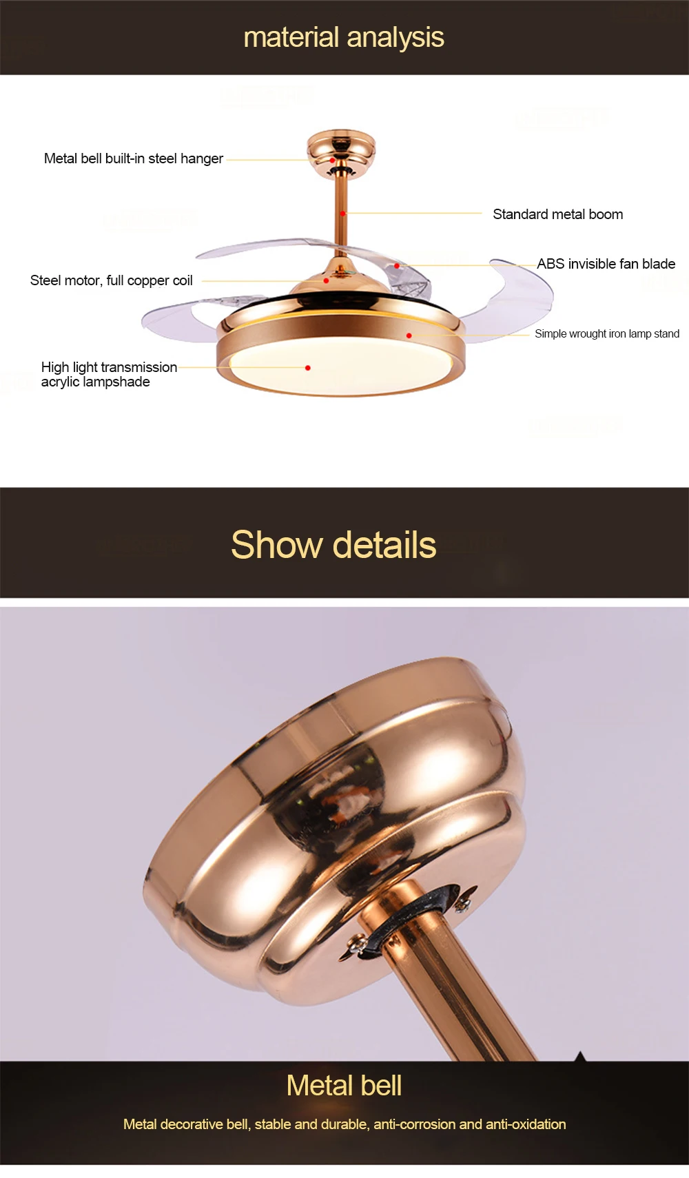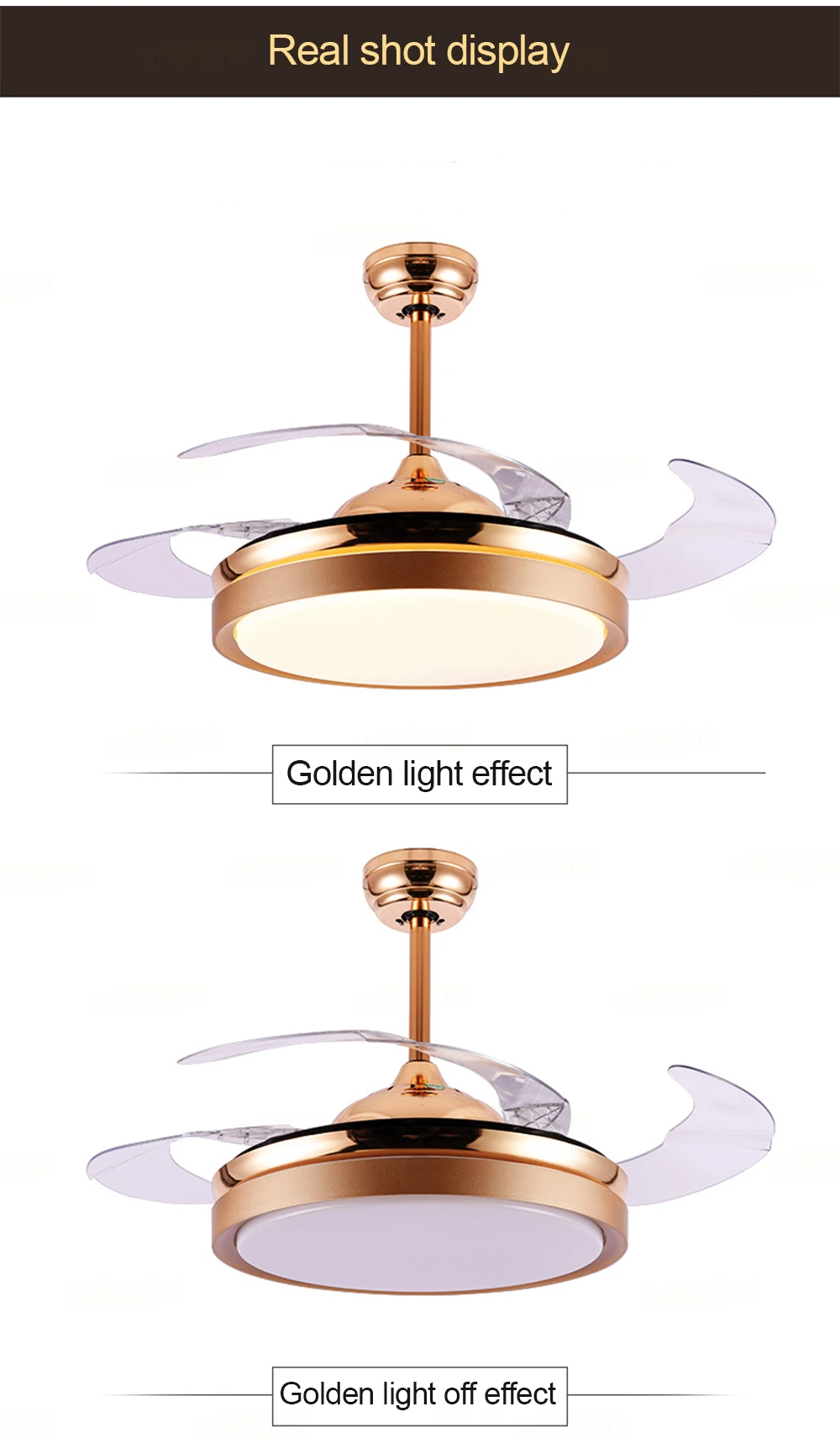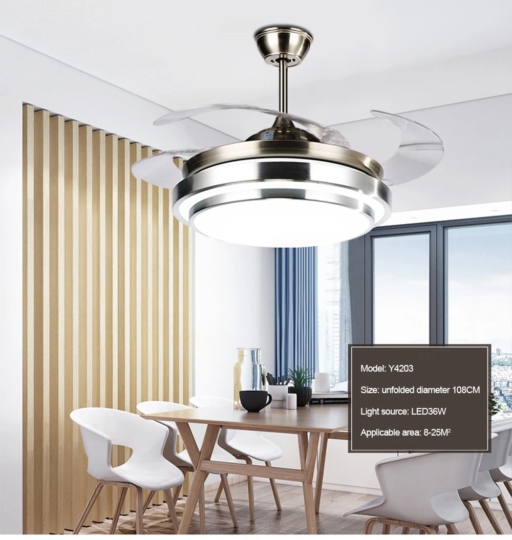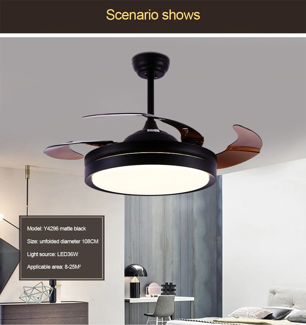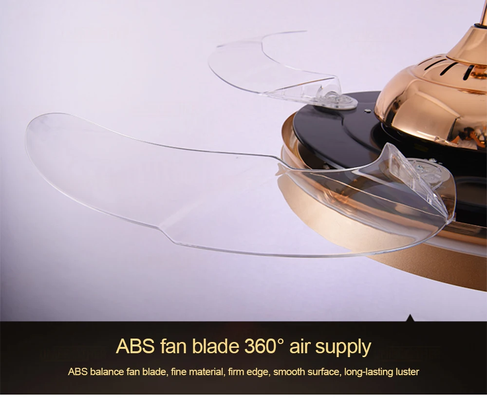 Модель: Y4296 Gold Размер: диаметр 108 см * Высота 47 см Материал: абажур из АБС-пластика Лопасть вентилятора: акрил Цвет: Золотой Источник света: LED36W (три цвета затемнения) Применимое пространство: гостиная/спальня/ресторан/гостиная и т. д. Использование пространства: 8-25m2 Расширенный диаметр 108 см Стандартная конфигурация: пульт дистанционного управления