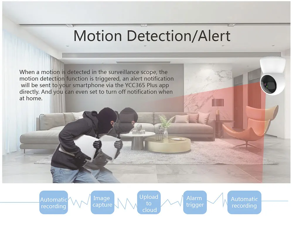 При обнаружении движения в диапазоне мониторинга будет срабатывать Функция обнаружения движения, а уведомление о тревоге будет отправлено непосредственно на ваш смартфон через мобильное приложение. Вы можете даже выключить уведомления, когда находитесь дома.