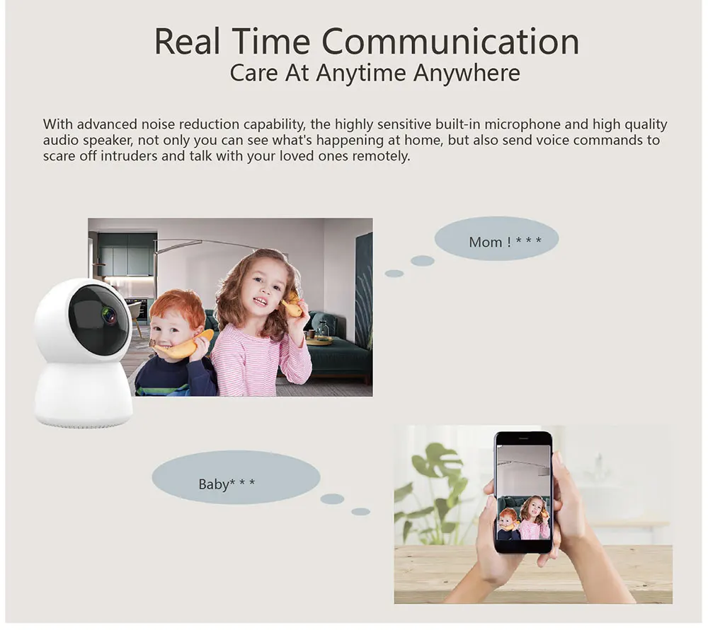 Уход за в любое время и в любом месте С улучшенным шумоподавлением, высокочувствительным встроенным микрофоном и высококачественным Аудио спикером, вы не только можете увидеть, что происходит дома, но также отправляйте голосовые команды, чтобы отпугивать незваных и общаться с близкими удаленно.