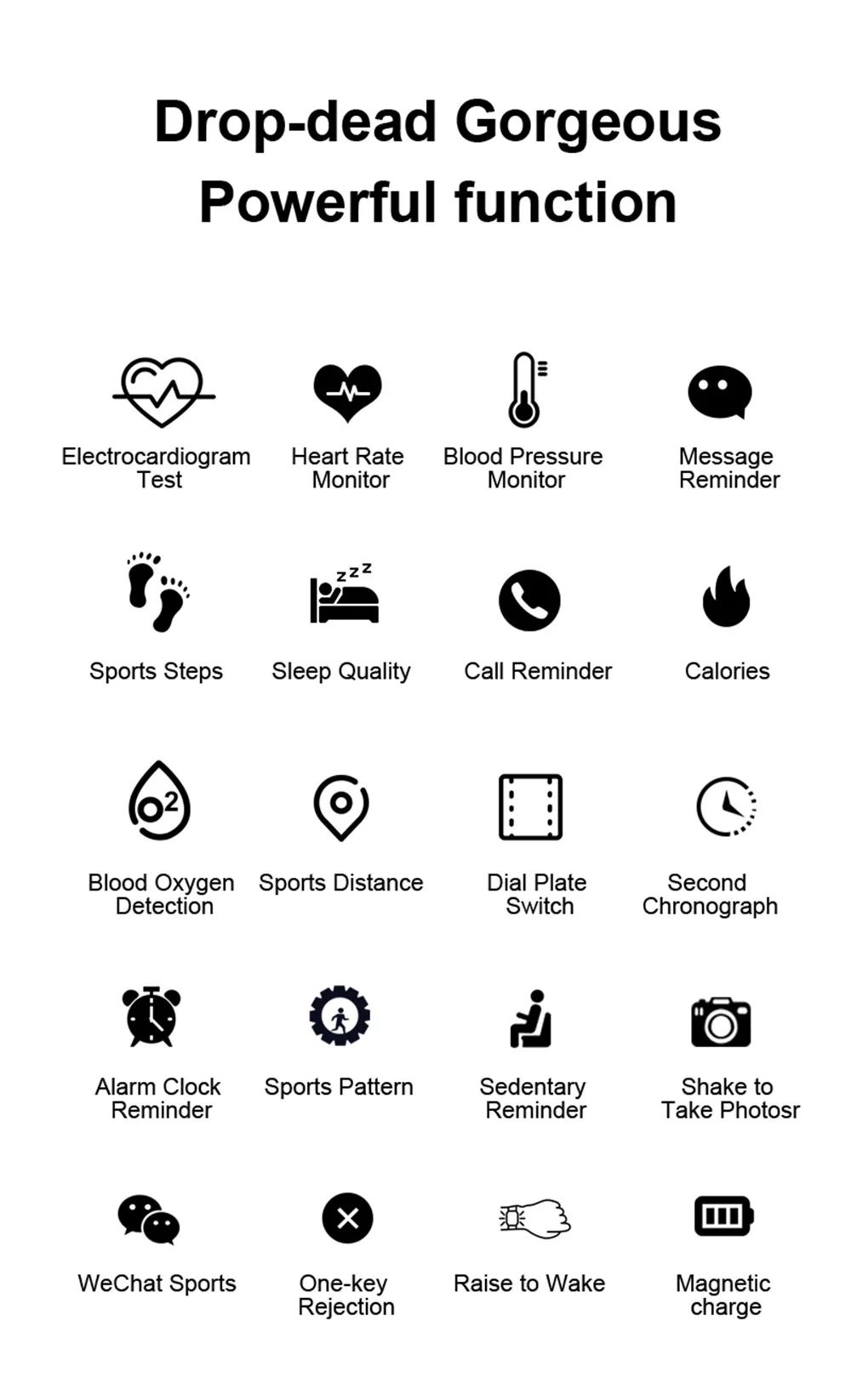 GPS навигация, сеть 3G/4G, кровяное давление, кислород крови, ЭКГ PPG, монитор сердечного ритма Dynimac, мультиспортивный режим: бег, плавание, езда, игра в бадминтон. Автоматическая идентификация языков. Высота, давление воздуха, WIFI, шагомер, водонепроницаемый, монитор сердечного ритма, монитор сна, напоминание о сидячем положении, камера 5 м, шагомер, мульти спортивные режимы, профессиональный анализ данных о здоровье, новая ОС часов, вызов sim-карты, температура, вызов Bluetooth, синхронизация уведомлений...