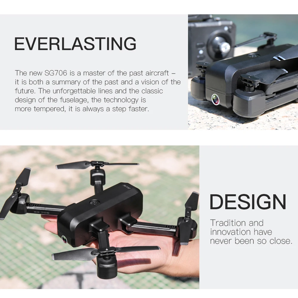 SG706 Радиоуправляемый Дрон с двойной камерой оснащен4KHD камера, оптическая система позиционирования потока и может управляться с помощью телефона. Он специально имеет функцию отслеживания изображения и распознавания жестов, поможет вам освободить руки и сконцентрироваться на фотографировании.