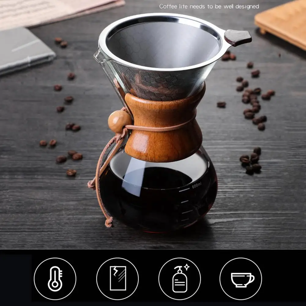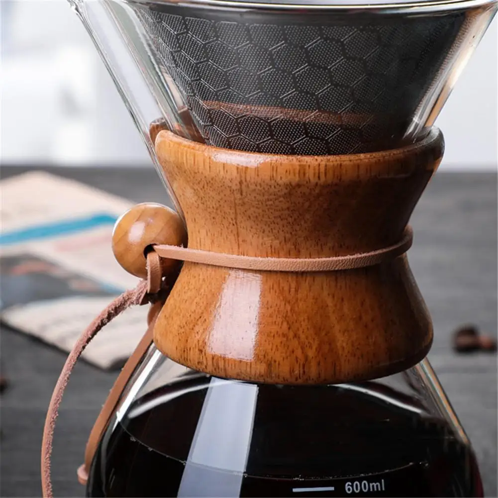 3. Сохраняет тепло дольше: Изготовлен из ультра-прочного BPA без толстого боросиликатного стекла, чтобы удерживать температуру кофе, в то время как он фильтрует горячий кофе и красивый деревянный воротник с кожаным галстуком. Постоянный двойной слой 304 из нержавеющей стали постоянные фильтры.