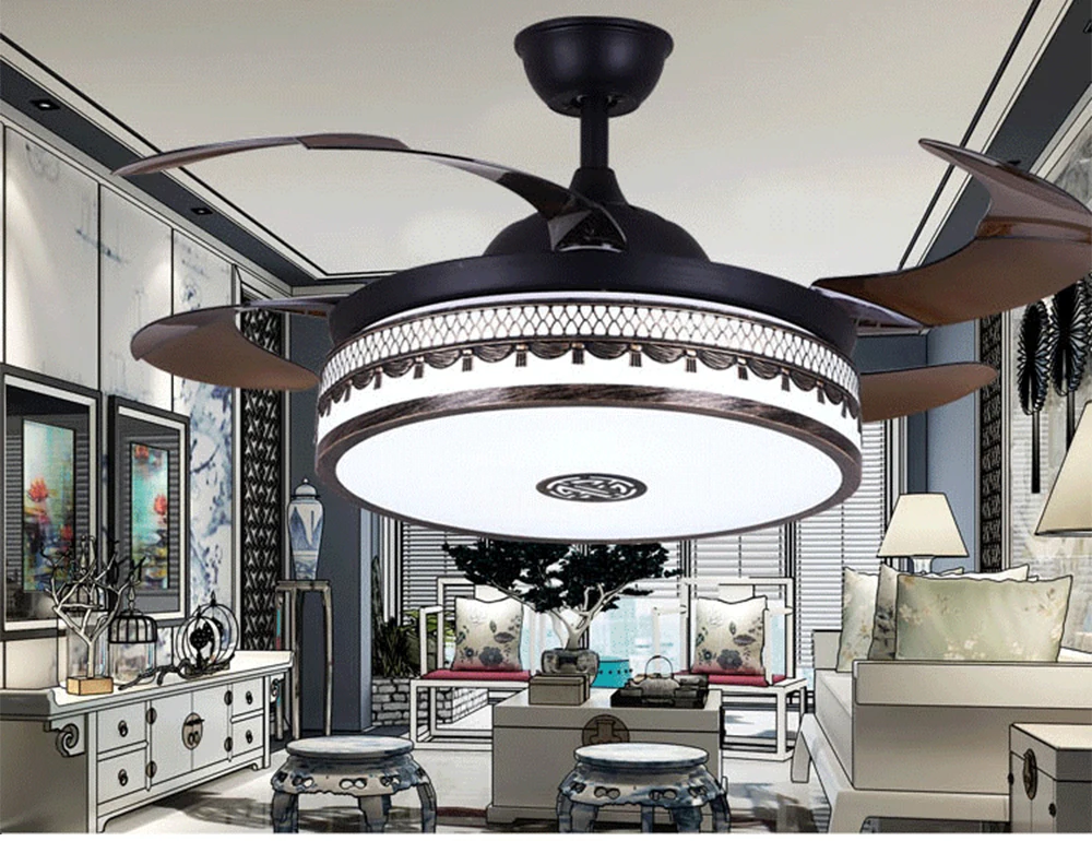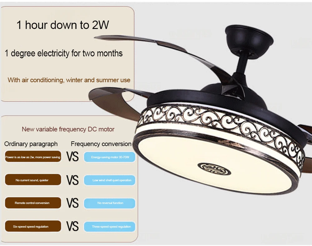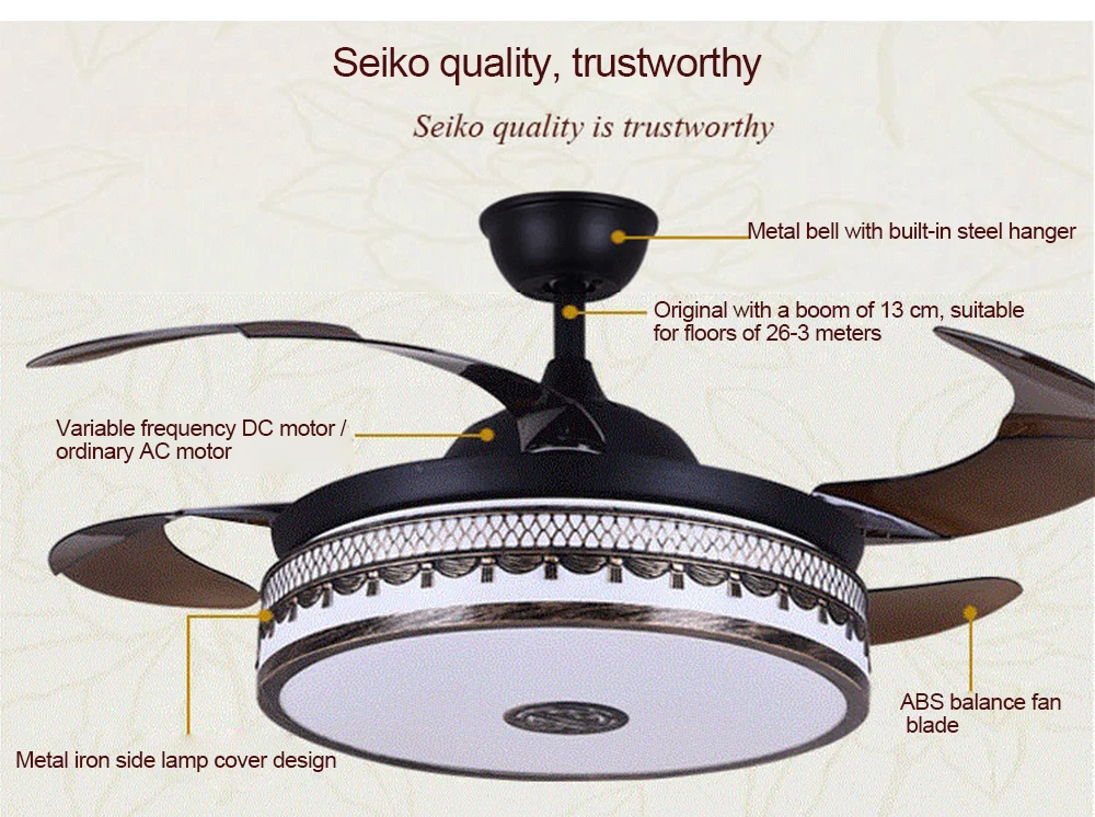 1. Металлический колокольчик со встроенной стальной вешалкой 2. Оригинал со стрелой 13 см, подходит для пола 26-3 метра 3. Двигатель постоянного тока с переменной частотой/Обычный двигатель переменного тока 4.ABS балансировочный лопасть вентилятора 5. Металлическая металлическая боковая крышка лампы