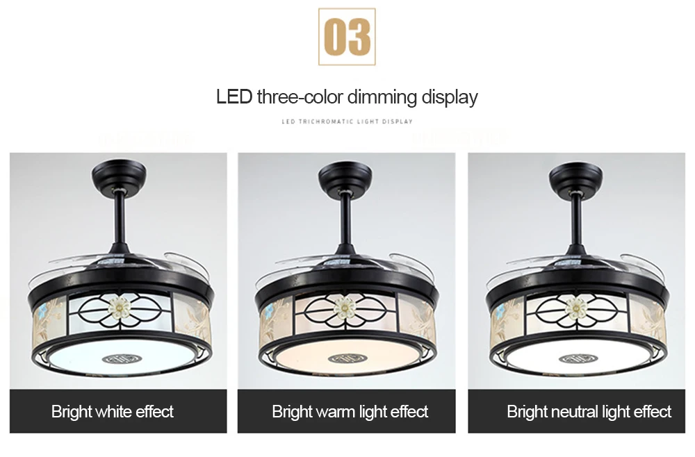 Размеры: 108 см (42 дюйма) Имя: Невидимый вентилятор светильник Цвет: черный светильник источник: светодиодные лампы Светильник Цвет: белый светильник, теплый белый светильник, nautral светильник пространство: 15-30m2 Вес брутто: 13 кг Материал: акрил + железо + АБС Применение: гостиная, спальня, столовая