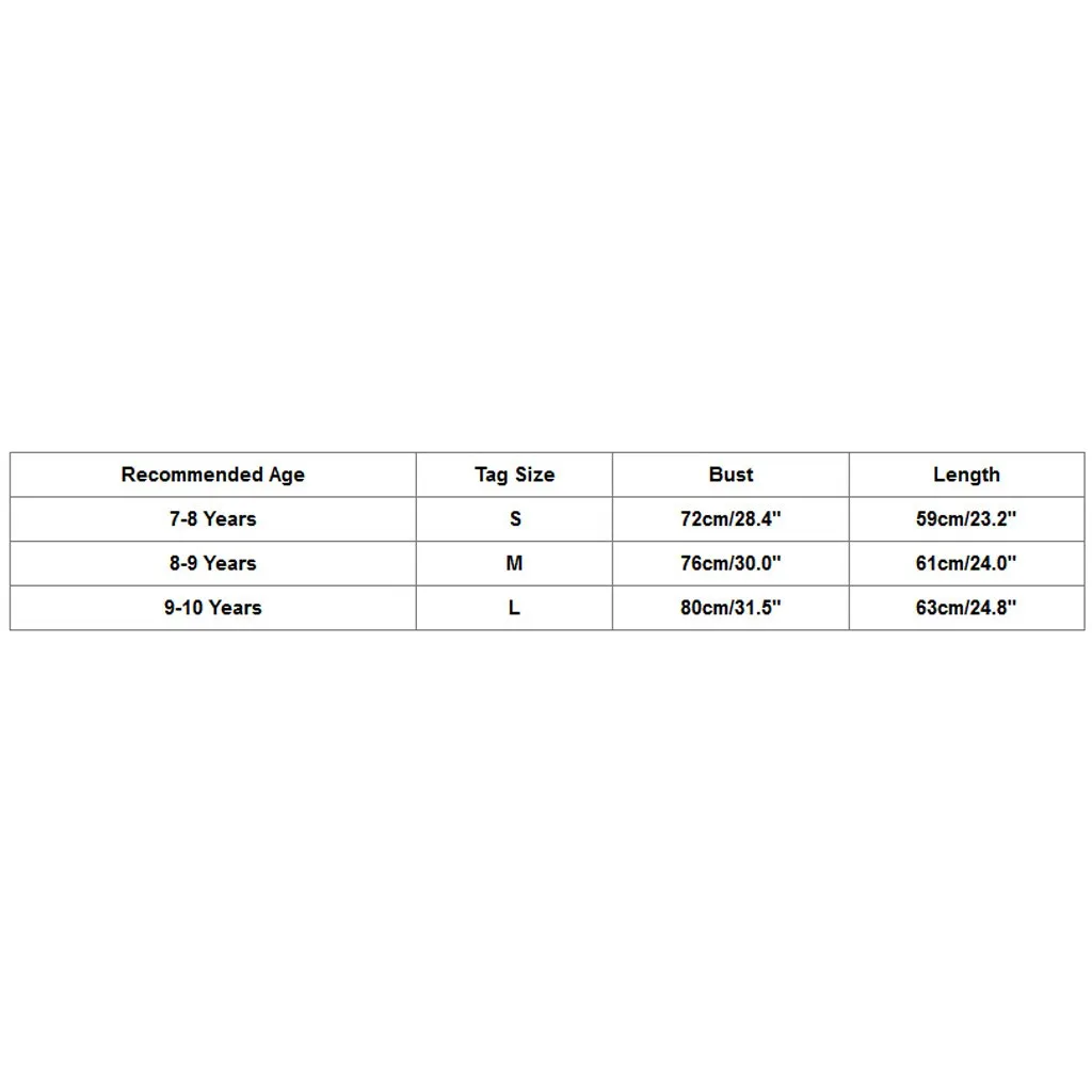 Размеры Этикетка Размеры Обхват груди Обхват талии Длина От 7 до 8 лет S 72 см/28,35'' 48 см/18,90'' 59 см/23,23'' От 8 до 9 лет М 76 см/29,92'' 52 см/20,47'' 61 см/24,02'' От 9 до 10 лет L 80 см/31,50'' 56 см/22,05'' 63 см/24,80''