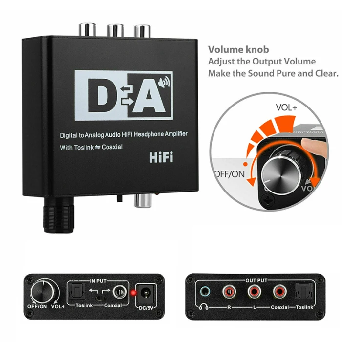 4. Поддерживает регулятор громкости, регулятор громкости только для регулировки громкости интерфейса наушников и интерфейса RCA, а не для коаксиального.