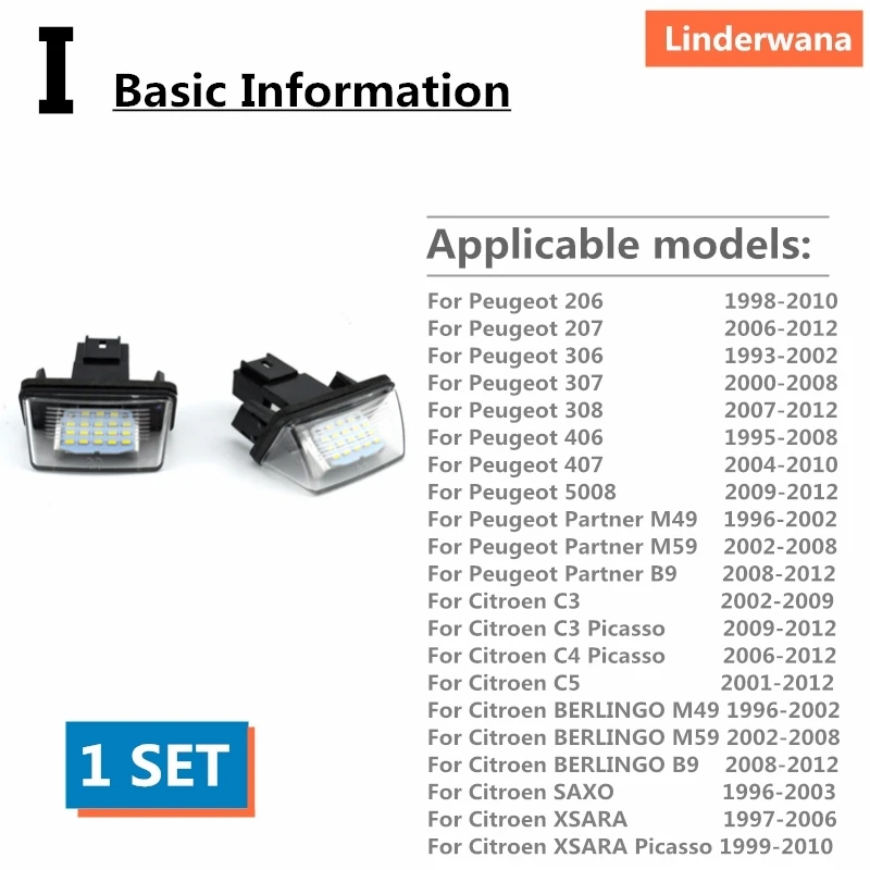 Технические характеристики: Материал: ПК Мощность: 1,44 W Цветовая температура: 6500K Продолжительность жизни: 30000 часов Светильник источник света: светодиодный Напряжение: 12V Ток: 0,12 (A) Размер: 56*30*64 (мм) Применимые модели: Для Peugeot 206 1998-2010 Для Peugeot 207 2006-2012 Для Peugeot 306 1993-2002 Для Peugeot 307 2000-2008 Для Peugeot 308 2007-2012 Для Peugeot 406 1995-2008 Для Peugeot 407 2004-2010 Для Peugeot 5008 2009-2012 Для Peugeot Partner M49 1996-2002 Для Peugeot Partner M59 2002-2008 Для Peugeot Partner B9 2008-2012 Примечания: 1. Возможны незначительные отклонения в размере из-за ручного измерения, различных методов измерения и инструментов. 2. Изображение может не отображать фактический цвет товара из-за различного фотографирования светильник, угол и дисплей монитора. Упаковка pureglas 2 фонаря номерного знака Посылка включает в себя: 2 * лампа номерного знака