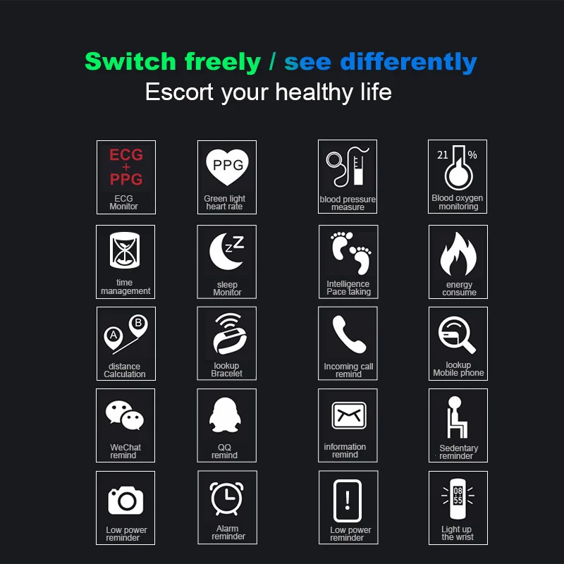 Main Features:ECG+PPG Heart Rate monitor health wristband Blood Pressure watch Blood Oxygen smartwatch Smart watch waterproof IP67 Class Waterproof, Dust-proof, Sweat-proof Face Washing will not affect the normal use of hand rings Color screen Bracelet (1.14 inch TFT LCD. Resolution 135*240) Basic Operating Functions (Bluetooth Connection/Disconnection Low Point/Charging Device Password Settings Firmware Upgrade and Restore Factory Settings) Find Stopwatch Countdown Alarm to Remind Caller Reception (Silent Rejection Mode) Power Display Standard exercise functions (step counting, distance, calorie blood pressure, PPG pulse rate, sleep oxygen ECG heart rate detection) Sedentary reminder/Bluetooth disconnection reminder/12-hour/24-hour automatic switching General function (wearing detection and binding equipment remote control photography main interface style setting wrist-turning bright screen function switch default state) Call notification (can display contacts), message notification (can display message content) QQ push, Wechat push, WhatsApp push, Skype push, Facebook push, Twitter push reminder, Line push reminder, Linkedln push reminder lnstagram push reminder Snapchat push reminder Gmail push reminder SMS push reminder other applications push Upgrading Firmware Function in Air OTA /Synchronize data to APP APP/APK Download Mode: (Android can search for H Band in Android App Market and download and install it directly). (Apple can search for H Band in App Store and download and install it directly.) Download and Install Two-Dimensional Code Scanning(H Band) Android 4.4 and above, IOS 8.0 and above Bluetooth 4.0 Standby time:25-30 days Working hours:4-5 days