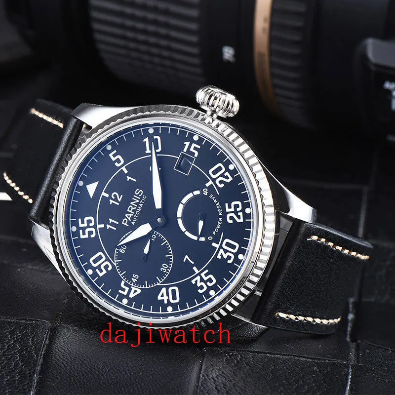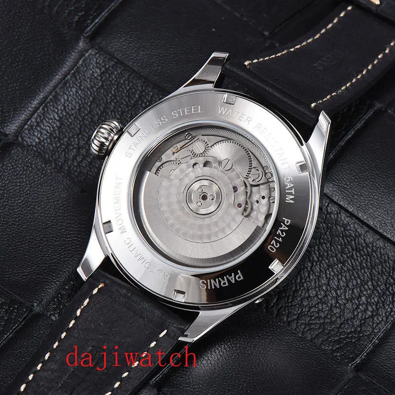 Новые 44 мм Parnis Автоматические Мужские механические часы с кожаным ремешком Мужские часы с сапфировым кристаллом мужские водонепроницаемые часы