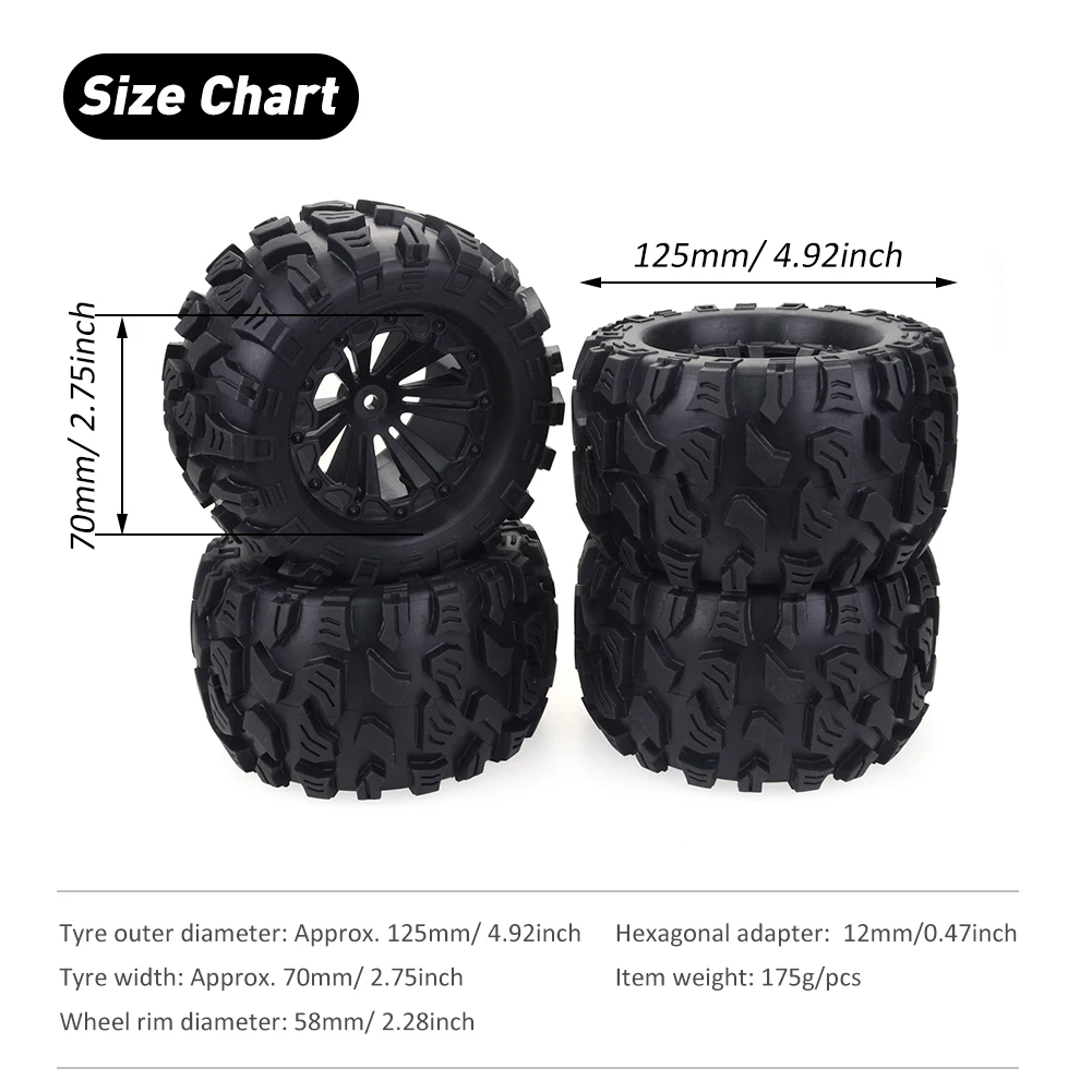Пункты маркированного списка: 1 、✔Он подходит для RC 1: 10 альпинистских автомобилей, внедорожных транспортных средств, 1 монстр грузовик, Йети, багги. 2 、✔Он прочный и водонепроницаемый, сцепление шины зерна. Отлично работает на снег и морозную грязь светильник. 3 、✔Изготовленная из semisoft резины, резина очень жесткая. Вставки из пеноматериала также являются основным плюсом. 4 、✔Они широкие и мягкие. Рулон как легко. Шестигранный адаптер: 12 мм/0,47" 5 、✔Подходит для Traxxas HSP Tamiya, Kyosho, HPI, Savage, XS, TM Flux, MT, LRP 1:10 RC автомобилей Описание: ✔Он подходит для RC 1: 10 альпинистских автомобилей, внедорожных транспортных средств, Monster truck, Bigfoot, багги. ✔Он прочный и водонепроницаемый, сцепление шины зерна. Отлично работает на снег и морозную грязь светильник. ✔Изготовленная из semisoft резины, резина очень жесткая. Вставки из пеноматериала также являются основным плюсом. ✔Они широкие и мягкие. Рулон как легко. Шестигранный адаптер: 12 мм/0,47" ✔Подходит для Traxxas HSP Tamiya, Kyosho, HPI, Savage, XS, TM Flux, MT, LRP 1:10 RC автомобилей -Материал: Резина Размеры таблицей: Внешний диаметр шины: прибл. 125 мм/4,92 дюйма Ширина шины: прибл. 70 мм/2,75 дюйма Диаметр обода колеса: 58 мм/2,28 дюйма Шестигранный адаптер: 12 мм/0,47 дюйма Вес изделия: 175 г/шт. Посылка включает в себя: 4x Шины и колеса