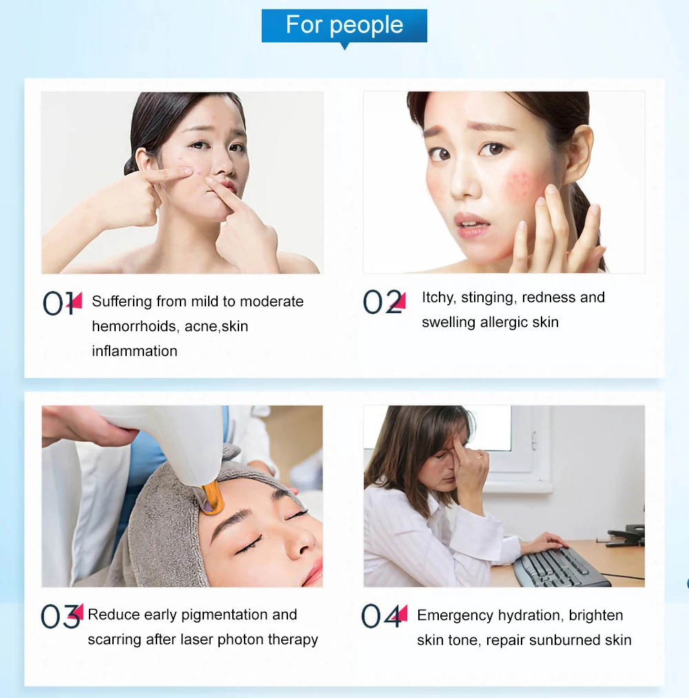 Проблемы с кожей лица, такие как от легкой до средней акне, акне, акне и т. Д. 2: аллергия на кожу. Из-за сезонных изменений, погоды и т. Д., он вызывает сухой зуд, пощипывание, покраснение и отек. 3: После лазерной фотонной терапии. Облегчают раннюю гиперпигментацию после лазерной фотонной терапии и уменьшают роль адъювантной терапии в обработке эпилепсии. 4. Экстренная помощь. Погода сухая, на коже не хватает воды, после работы тусклый и солнечный, после солнечных ожогов красный и опухший.Особенности