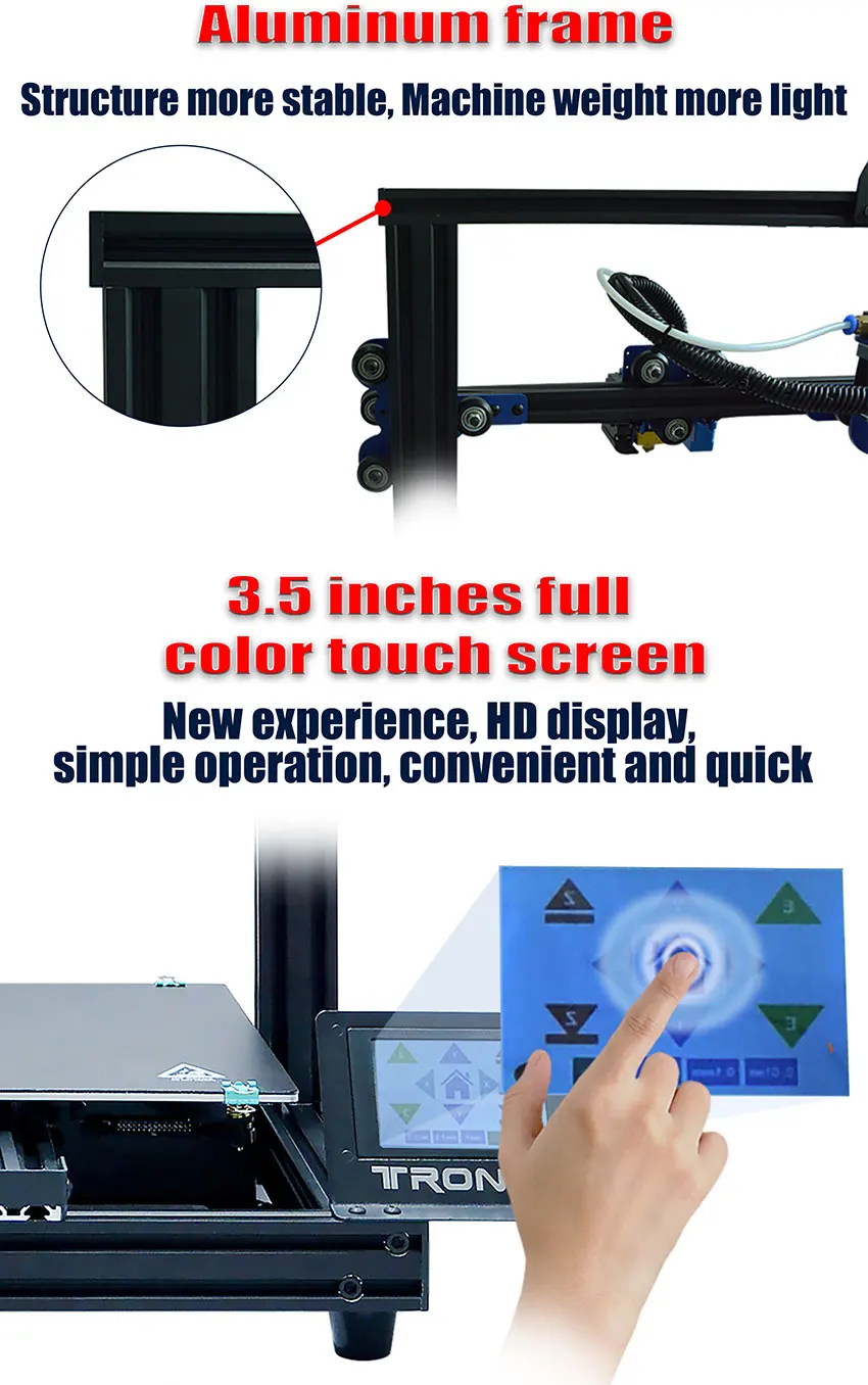 Более важные особенности ---- только экструдер Titan, крайне низкий уровень шума, материнская плата, 3,5 дюймов полный Цвет сенсорный Экран, возобновить печать после Мощность off, нить накала-Обнаружение выключения, автоматическое выравнивание и т. д.