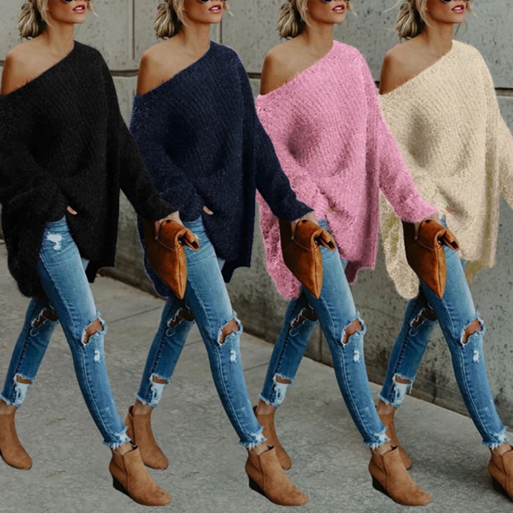 Женский сексуальный вязаный свитер с открытыми плечами, однотонный Свободный пуловер с расклешенным рукавом, джемперы, женский норковый кашемировый свитер, пончо