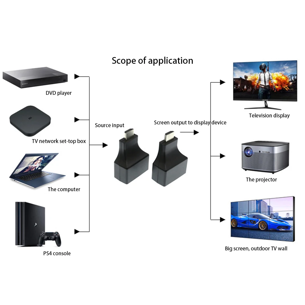 1. Подключите фиксированный Кабель HDMI отправителя к входному источнику HDMI, например, для HD-DVD,PS3,STB и т. д.