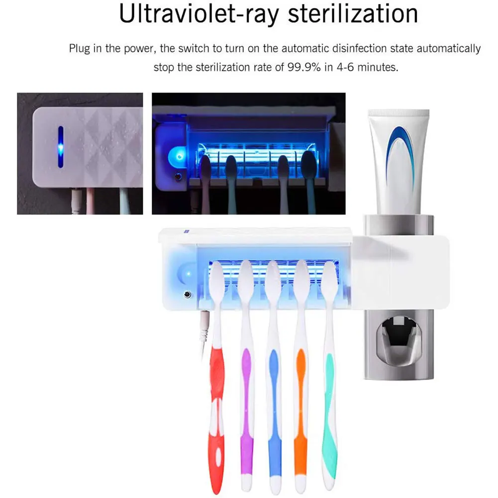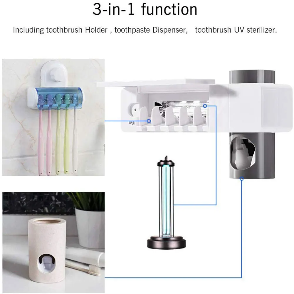 3 в 1 Функция: стерилизатор зубной щетки включает держатель зубной щетки, дозатор зубной пасты и УФ-стерилизатор зубной щетки.