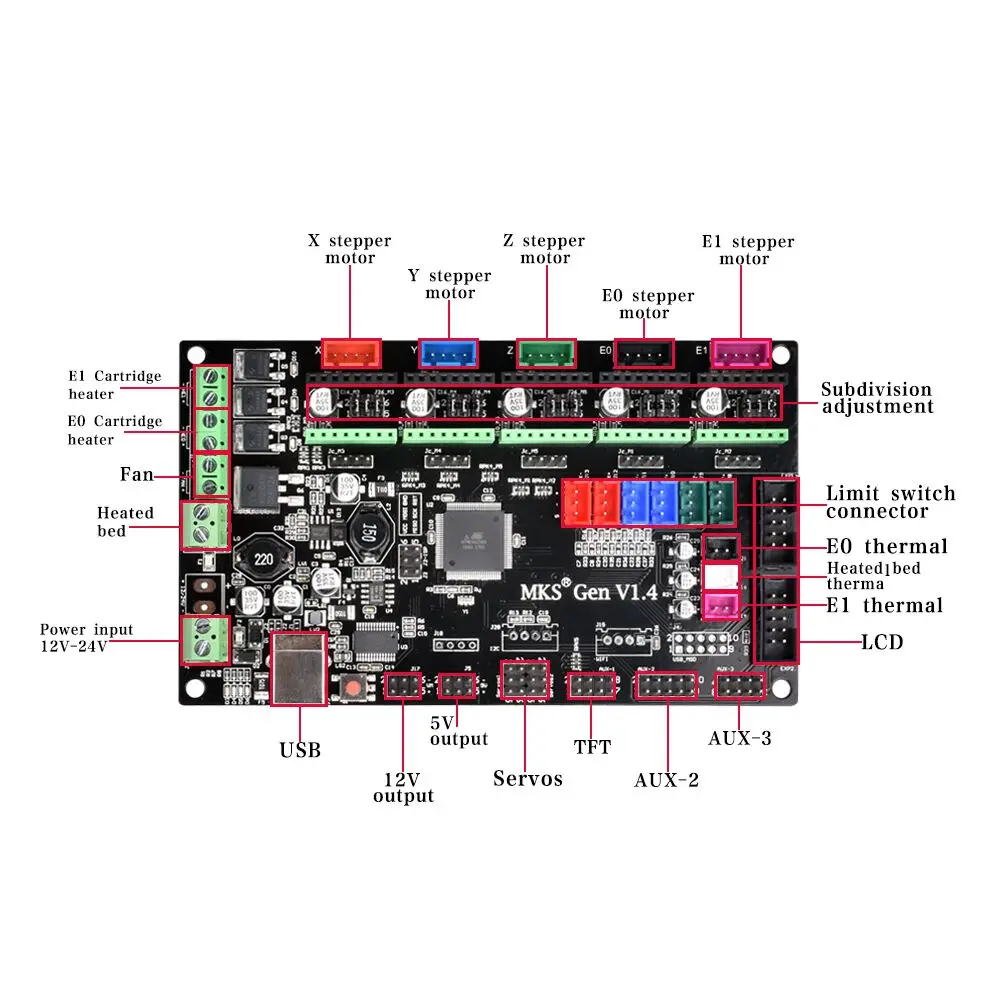 Преимущества:1, Mega 2560 и ramps1.4 набор на плате, чтобы решить сложную комбинацию интерфейсов Ramps1.4, проблему поломки.2. Замените привод двигателя, привод и 4988 8825 привод.3, схема с высоким качеством 4-секционный измельчитель для специй, тепло и специальную оптимизацию; Пандусы 2 полки.4. Использование МОП-транзистора высокого качества и лучшее рассеивание тепла.5, с помощью специального питания чип, поддержка 12V-24V вход питания, преобразователь напряжения чип для того, чтобы разрешить проблему жары пандусы.6, может принимать входную мощность 24 В при той же системе, может быть ток горячей кровати уменьшен до 1/4, эффективное решение проблем с нагревом труб горячей кровати MOS.7, Прошивка может использовать прошивку с открытым исходным кодом Marlin, ramps1.4 идентичная конфигурация и может непосредственно заменить Ramps1.4.8, может быть подключен к панели управления и 12864LCD Ramps1.4,2004LCD панели управления. (не может быть уверен, что все стили 12864LCD и 2004LCD)9, предназначен для импульсных и направляющих выходов двигателя для легкого подключения к высокому току для добавления большого тока (например, 2А, 5А) цепи привода двигателя.10, защищены Ramps1.4 на сервоприборах, AUX-1, AUX-2 интерфейс, который обеспечивает три 5V Выход, три 12V выхода.TMC2130-V1.1Введение:TMC2130-V1.1-это новый модуль, который оптимизирован и обновлен, чтобы решить проблему, которую старые драйверы не могут выбрать для использования режима работы SPI.Режим работы SPI TMC2130-v1.1 может напрямую выбирать ток драйвера, разделение драйвера и другие параметры через прошивку, что делает эти параметры более точными. Использование последовательных секвенсеров может значительно уменьшить нагрузку на чип и эффективно избежать таких проблем, как отклонение хода, шаг склеивания и ошибка, вызванные перегрузкой чипа.A:1 шт. * MKS Gen V1.4B:1 шт. * MKS Gen V1.4 с 5 шт. DRV8825