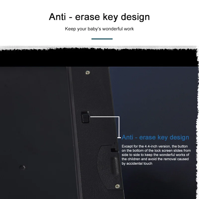 Цифровой графический планшет имеет небольшой переключатель на задней панели для блокировки экрана, избегая удаления рисунка случайно и сохраняя прекрасный рисунок ваших детей в течение длительного времени.