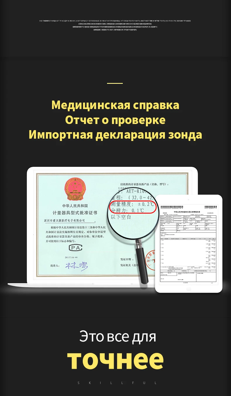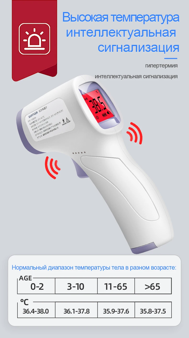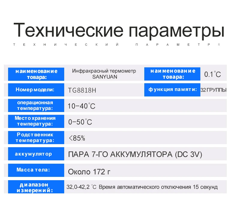 Название продукта: Инфракрасный ЛОБНЫЙ термометр Модель/Спецификация: aet-ridi Диапазон измерения: 32,0 ℃-42,2 ℃ Максимально допустимую погрешность: ± 0,2 ℃ (35,0 ℃-42,0 ℃) ± 0,3 ℃ (32. 0 ℃-34,9 ℃ и 42. 1 ℃-42. 2 ℃) Разрешение: 0,1 ℃ Функция памяти: 32 группы Рабочая среда: Температура 16 ℃-35 ℃; Относительная влажность 15% ~ 80% Давление воздуха: (70-106) кПа При транспортировке и хранении окружающей среды: Температура: -20 ℃-+ 55 ℃; Относительная влажность 15%-93% Давление воздуха: (70-106) кПа Мощность питания: два предмета с принтом no. 7 батареи (DC 3V) Внешний размер: 37 мм * 37 м * 138 мм Вес: около 47 г (без батареи) Автоматическое отключение: около 1 минуты, неиспользованный Упаковка: без батареи Комплектация: 1 шт. ЛОБНЫЙ термометр; 1 шт. Инструкции; 1 шт. сертификат квалификации