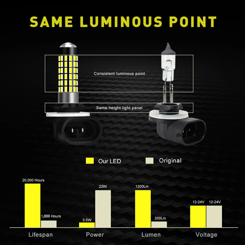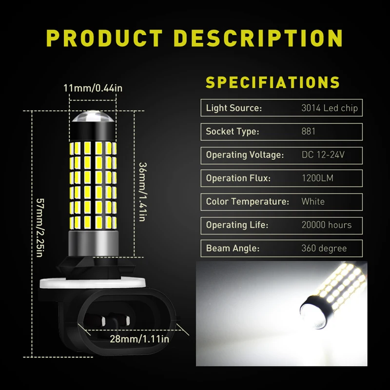 Светильник Тип: H27 881 Светильник исходной модели: высокий светильник 3014 светодиодных чипов Светильник Цвет: 6000 K холодный белый Световой поток: 1200LM Рабочее напряжение (В): 12 В DC Скорость IP: IP68 (сильный водонепроницаемый) Тепловыделение: Алюминиевый интегрированный теплоотвод Рабочая температура: от-40C до + 105C Угол обзора: 320 градусов Срок службы: более 100000 часов Гарантия: 1 год Сертификаты: CE/RoHs