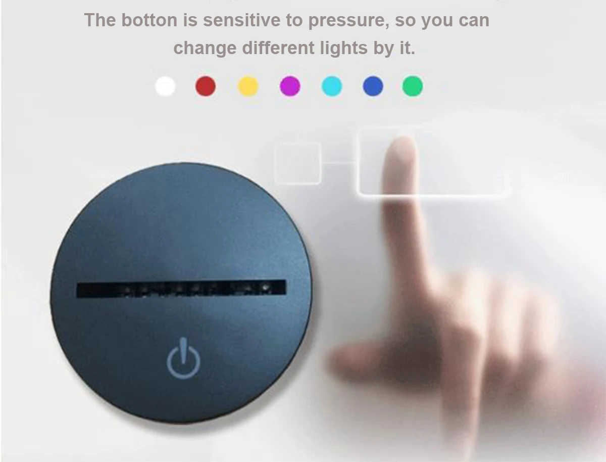 * Обеспечивает более 50000 часов яркого светильник * Включает в себя Энергоэффективный светодиодный светильник (экономия энергии) * Сенсорная кнопка для выключения, включения и изменения видимости цвета. * 7 цветов: белый, красный, зеленый, синий, желтый, голубой и розовый. * Легко включается/выключается удобный выключатель питания на подключенном шнуре * Автоматический режим изменения цвета доступен * Потребляемая мощность: 0012 кВт. Ч/24 часа * Светодиодный срок службы: До 50000 часов * 3D иллюзия пластины толщиной всего 4 мм * Длина кабеля USB: 150 см * Вес изделия: 300 г
