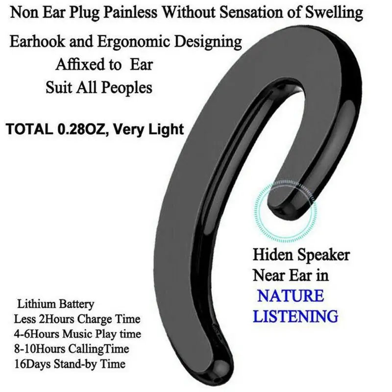 Особенности: комфортное ношение-свободно выбирайте обмен на ношение левого и правого уха, при этом очки не влияют на ношение. Совместимость с iOS, для Android, для WP системы, если устройства имеют Bluetooth, он может быть использован. Bluetooth 4,2 наушники с костной проводимостью, одиночные наушники с крючком-маленькие и скрытые, более удобные. Это очень светильник, безболезненное ношение в течение длительного времени, Новейшая концепция эргономики дизайна полностью за пределами ушной раковины. Чистый вызов и высокое качество-Встроенный высокопроизводительный литиевый аккумулятор, 5-6 часов непрерывной работы, 5-6 часов непрерывной работы, 1-2 часа быстрой зарядки. Акустический блок является внешним-громкоговоритель близко к уху, но он не внутри уха. Это поможет прослушивать окружающую среду в то же время, позволит вам сохранить безопасность для езды на велосипеде, бега, вождения и более портативный для бизнеса, работы. Технические характеристики: Профили Bluetooth: HSP1.2HFP1.6 A2DP1.3AVRCP1.5D11.3 Версия Bluetooth: V4.2 + EDR Беспроводной для измерения пульса: 2,4 ГГц чувствительность микрофона: 42Db продолжительность звонка: 5-6 часов, Модель: S-103 Размеры: 71,9*43,6*7 мм Емкость аккумулятора: 90 мА · ч Расстояние передачи: 12 м Время воспроизведения: 5-6 часов время работы в режиме ожидания: около 100 часов Время зарядки: около 1- 2 часов Напряжение зарядки: DC 5V Название продукта: костная проводимость материал наушников: пластик Рабочая температура: 10 °C-50 °C посылка в комплекте: 1 * USB кабель 1 * наушники с костной проводимостью 1 * Руководство