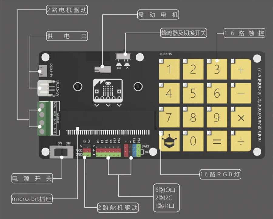Это математическая и автоматическая Плата расширения для micro:bit. Прост в использовании и подходит для широкого спектра применения. Мы разработали эту доску для двух вариантов применения: математические игры и управление автоматизацией. 16 программируемых сенсорных клавиш и RGB-светодиодов на плате обеспечивают богатую функцию и гибкий вход и выход. Кроме того, плата имеет 1 вибромотор, 1 зуммер, 2 порта двигателя, 2 серводвигателя и 9 портов расширения, что закладывает основу для использования в автоматизации управления приложением.