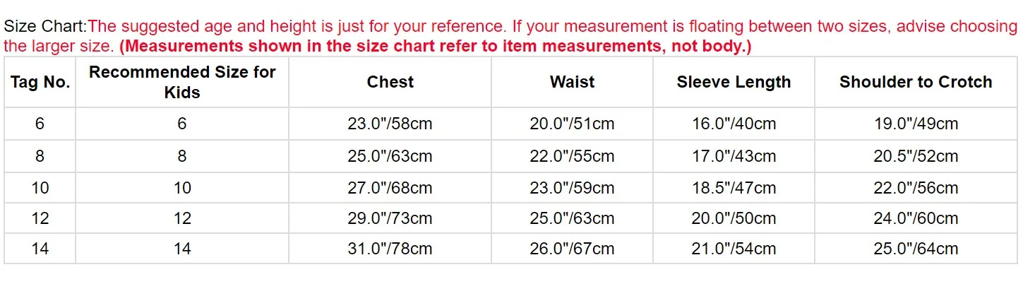 Размеры таблицей:Рекомендуемый возраст и рост указаны только для справки. Если под ваши замеры подходят два размера, мы рекомендуем выбрать больший размер.(Измерения, содержащиеся в таблице, относятся к товару, а не к телу.)