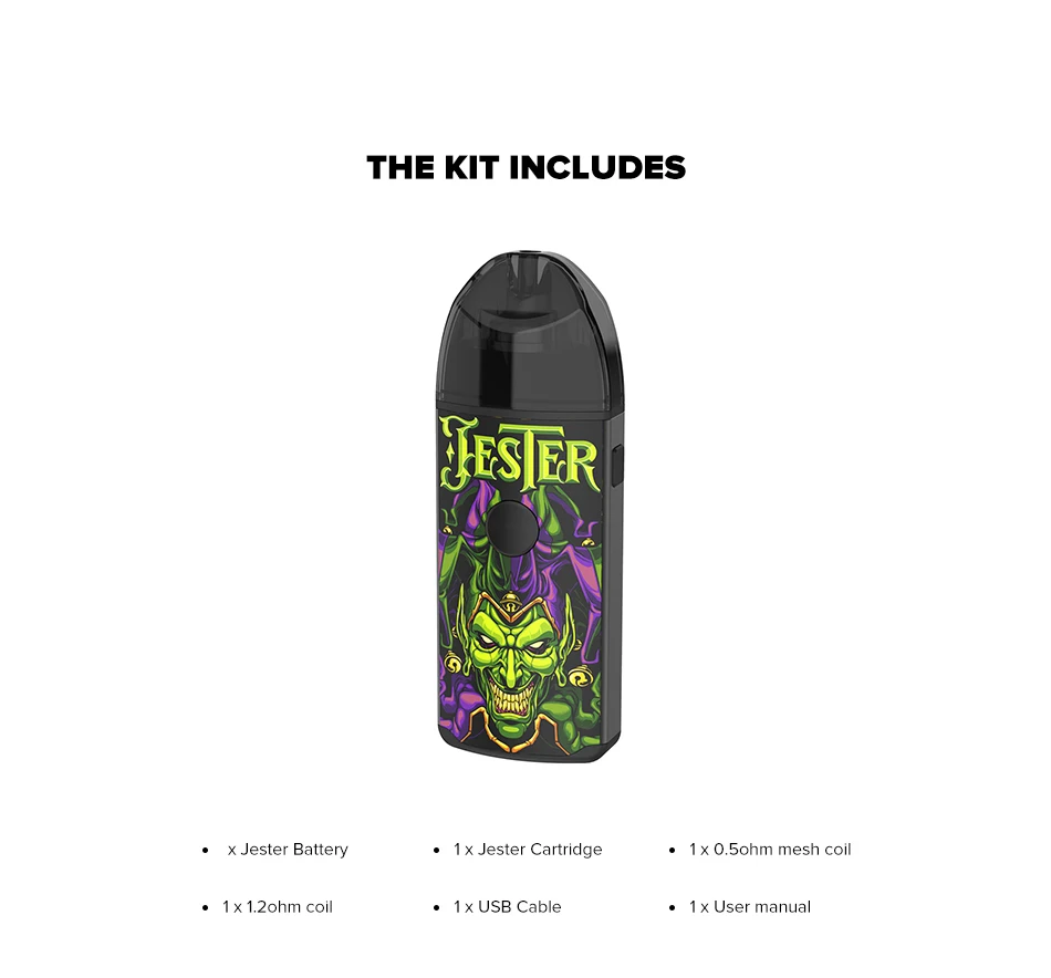 Pod отверстиями издание: 1 x Шут Батарея 1 x Шут картридж 1 х 0,5 Ом сетчатая катушка 1 x 1.2ohm катушки USB кабель (1 шт.); Руководство пользователя (1 шт.)