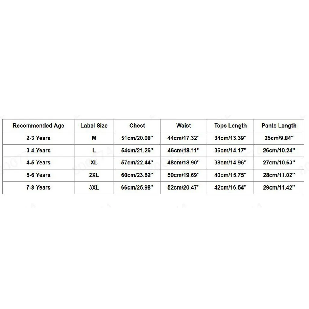 Рекомендуемый возраст Этикетка Размеры Обхват груди Обхват талии Топы Длина Брюки Длина От 2 до 3 лет М 51 см/20,08'' 44 см/17,32'' 34 см/13,39'' 25 см/9,84'' От 3 до 4 лет L 54 см/21,26'' 46 см/18,11'' 36 см/14,17'' 26 см/10,24'' От 4 до 5 лет XL 57 см/22,44'' 48 см/18,90'' 38 см/14,96'' 27 см/10,63'' От 5 до 6 лет 2XL 60 см/23,62'' 50 см/19,69'' 40 см/15,75'' 28 см/11,02'' От 7 до 8 лет 3XL 66 см/25,98'' 52 см/20,47'' 42 см/16,54'' 29 см/11,42''