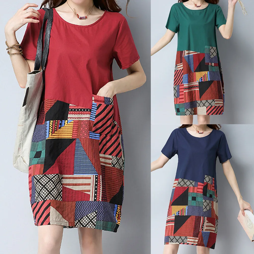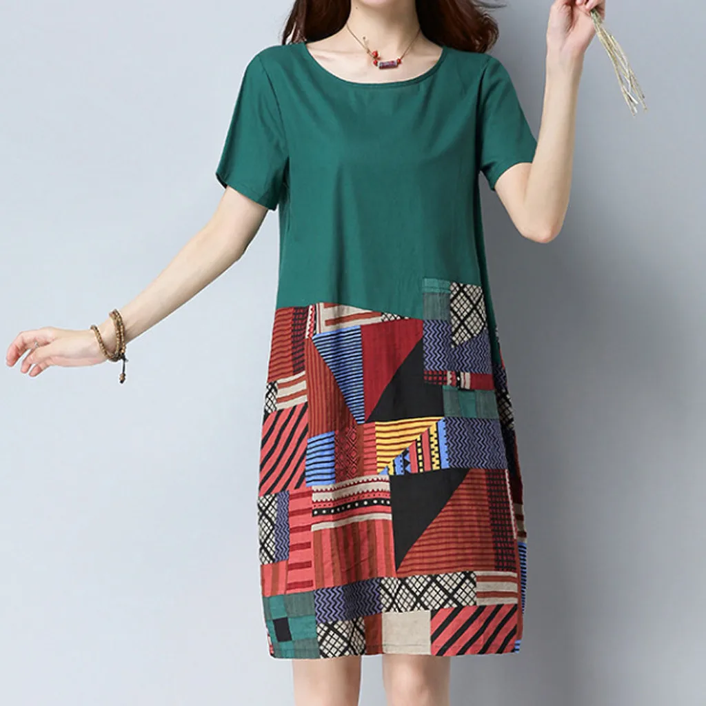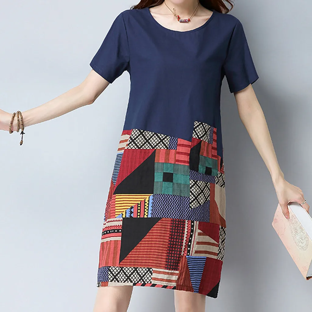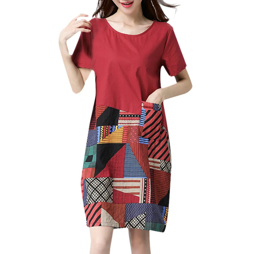 Женское повседневное хлопковое льняное платье с круглым вырезом и коротким рукавом, свободное платье с принтом