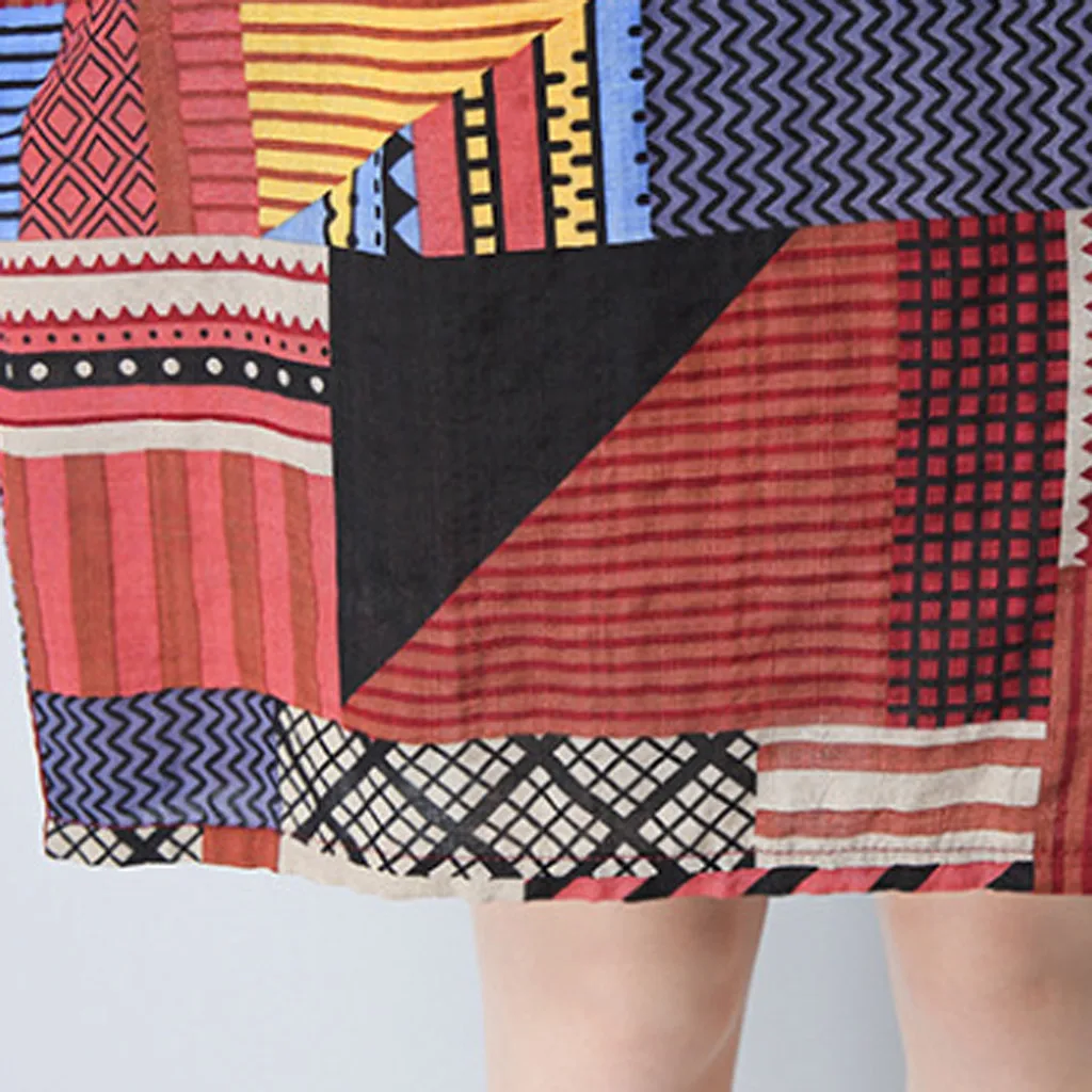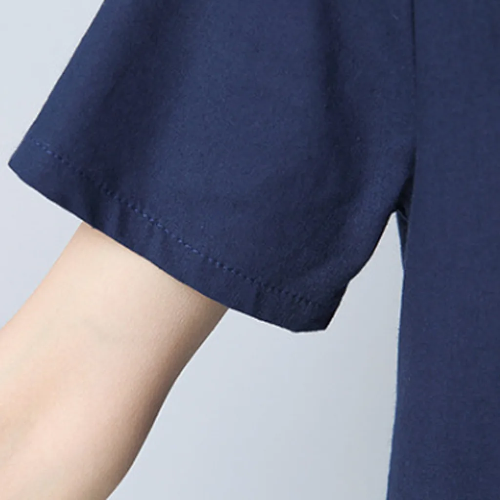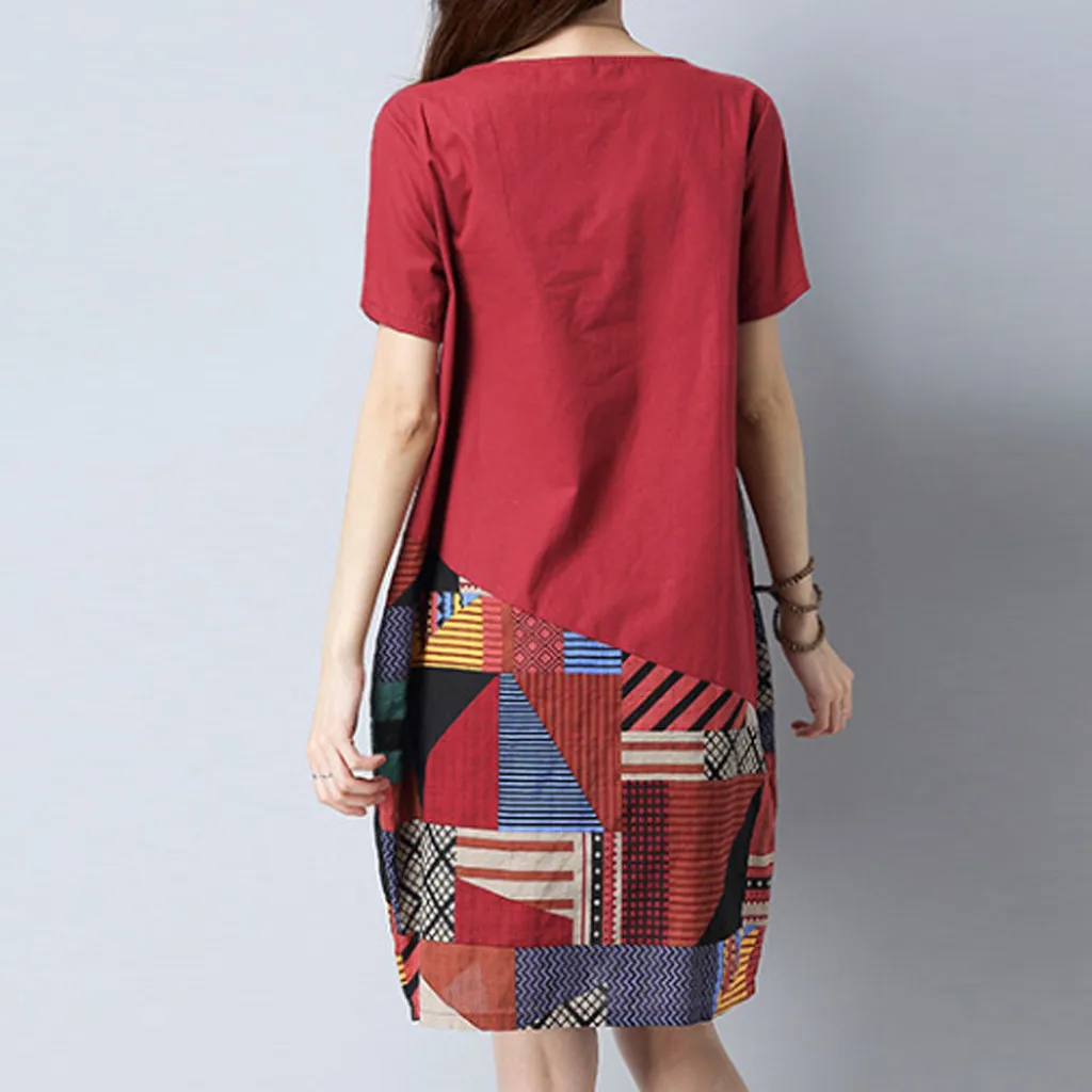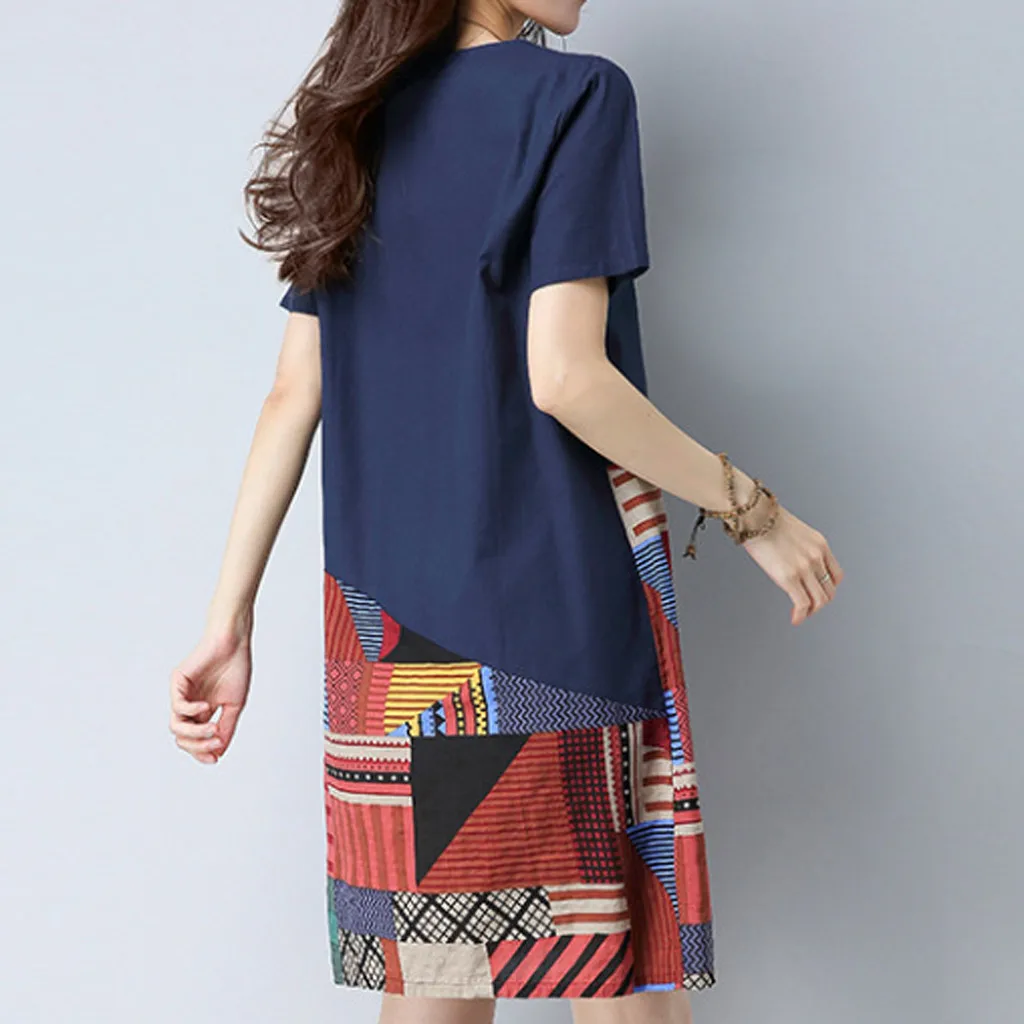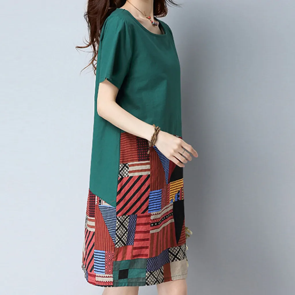 Женское повседневное хлопковое льняное платье с круглым вырезом и коротким рукавом, свободное платье с принтом