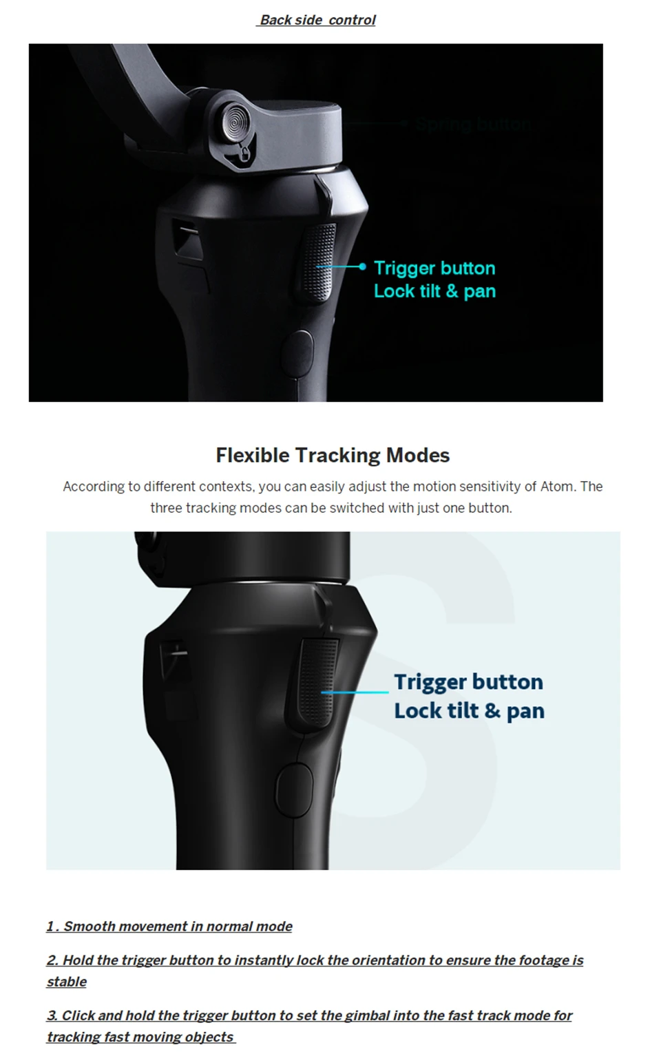 【Многофункциональные кнопки для мгновенного управления 】: ручка ATOM собирает богатый набор кнопок для управления функциями приложения gimbal и Snoppa. Даже без приложения, если Bluetooth вашего телефона подключен к Atom, кнопки на ручке могут управлять вашим телефоном, чтобы снимать или останавливать. В соответствии с различными условиями, вы можете легко настроить чувствительность движения атома.