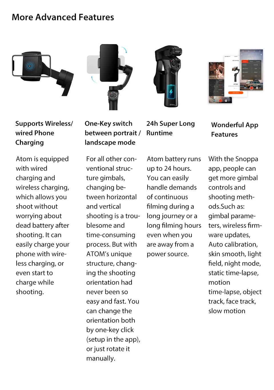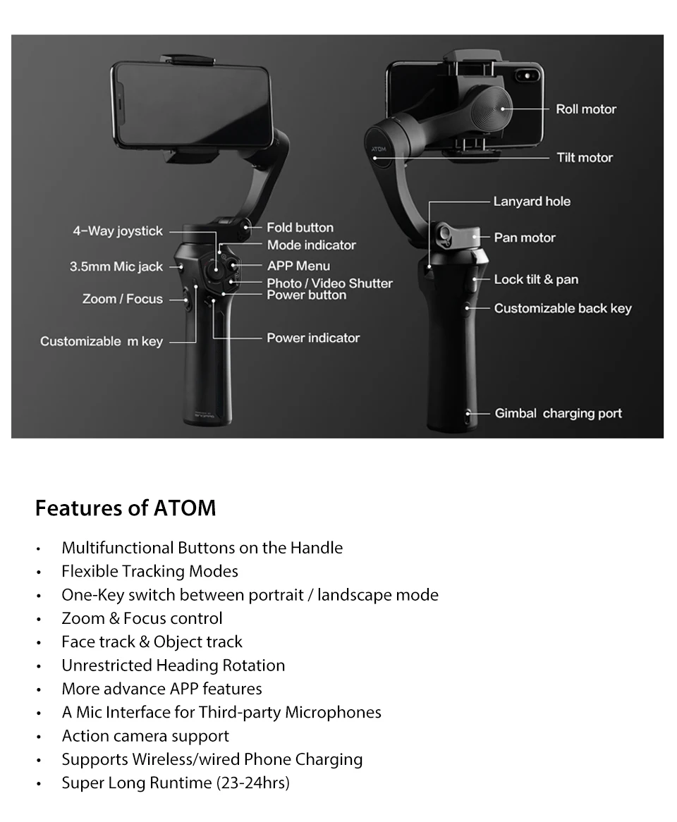 【 Поддерживает беспроводную/проводную зарядку телефона 】: Atom работает до 24 часов за одну зарядку. Он может легко заряжать ваш телефон без проводов. Что касается проводной зарядки, то на крепление телефона и стабилизатор шарнира не повлияет зарядный кабель.