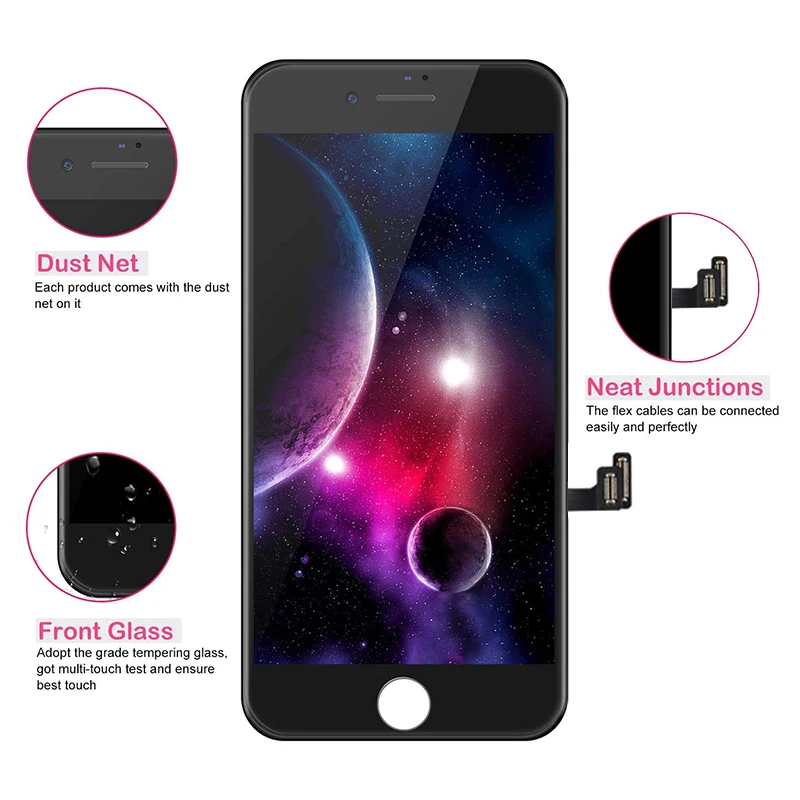 Примечания для установки: 1. Перед установкой убедитесь, что ваш телефон выключен. 2. Проверьте замену ЖК-дисплея, чтобы убедиться, что гибкий кабель находится в хорошем состоянии и Нет мусора/видимой пыли на соединителе. 3. Обратите внимание на чувствительные и незаметные гибкие кабели, и винты должны быть в правильном положении. 4, пожалуйста, перенесите нижнюю часть дома с вашего оригинального экрана, потому что только оригинальная нижняя часть сохраняет функцию touch ID. 5, мы рекомендуем смотреть онлайн-видео или заменить замену экрана с помощью опытных людей. Q & A В: если я установила замену экрана, как вы сказали, но черный экран/не может прикоснуться/иметь полосы. Что мне делать? О: Можете ли вы проверить и работать следующим образом? A. Пожалуйста, отключите телефон, затем Отделите экран и другую часть. B. Пожалуйста, проверьте гибкие кабели в хорошем состоянии, и на соединителе Нет мусора. Затем нажмите плотно на Ленточные кабели, чтобы убедиться, что они хорошо подключены. C. Перезагрузите телефон. Посылка включает в себя: 1 x набор для замены экрана 1 х Защитная пленка из закаленного стекла 1 отвертка (магнитная) 1 x набор магнитных инструментов для ремонта 1x Кабель зарядного устройства